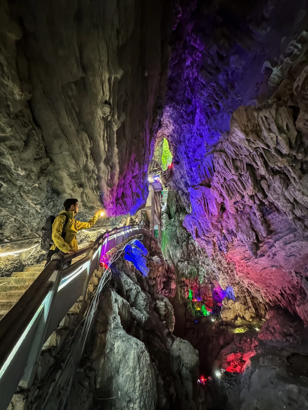 穿过瀑布,走进通灵宝洞,仿佛进入了一个光怪陆离的地下世界。巨型钟乳石千姿百态,洞中的地下河暗流涌动,河水清澈见底,在灯光的映照下,闪烁着神秘的光芒