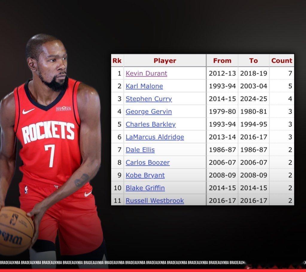 更疯狂的是…KD在对阵火箭队的季后赛中,得到30分以上的次数在NBA历史上是最多的(7次)