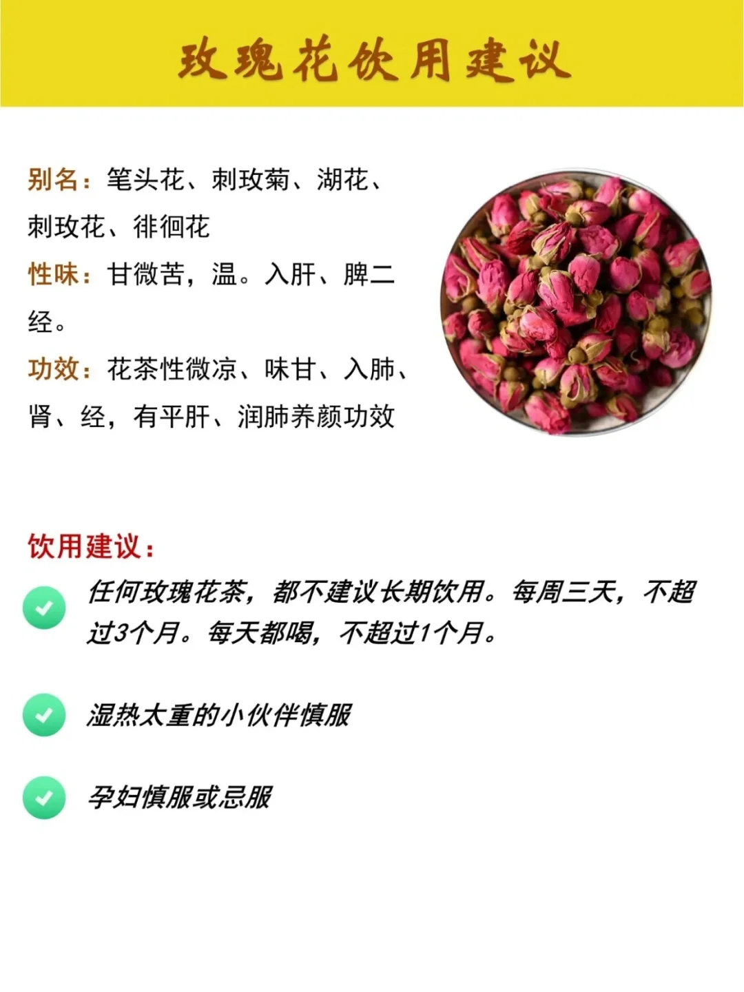 任何玫瑰花茶,都不建议长期饮用。每周三天,不超过3个月。每天都喝,不超过1个月。