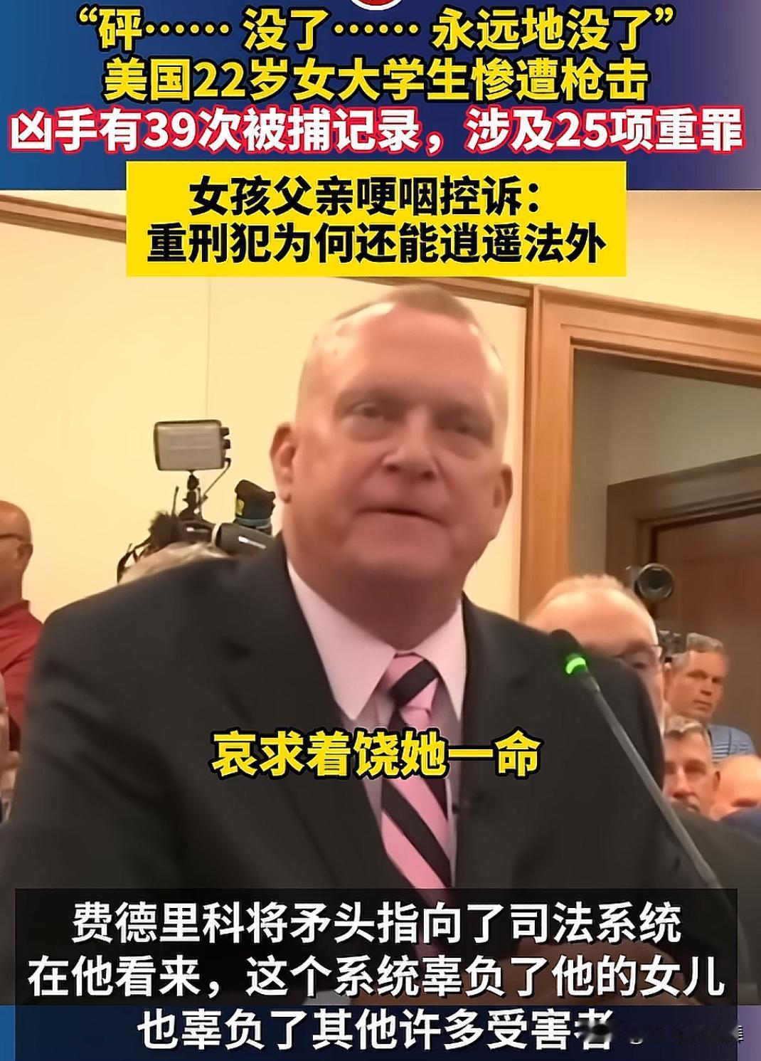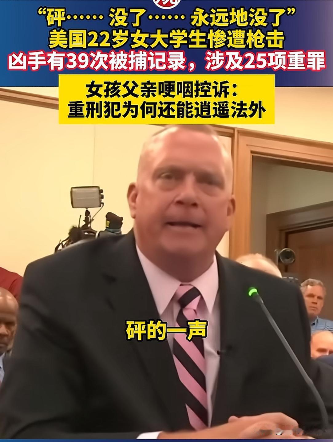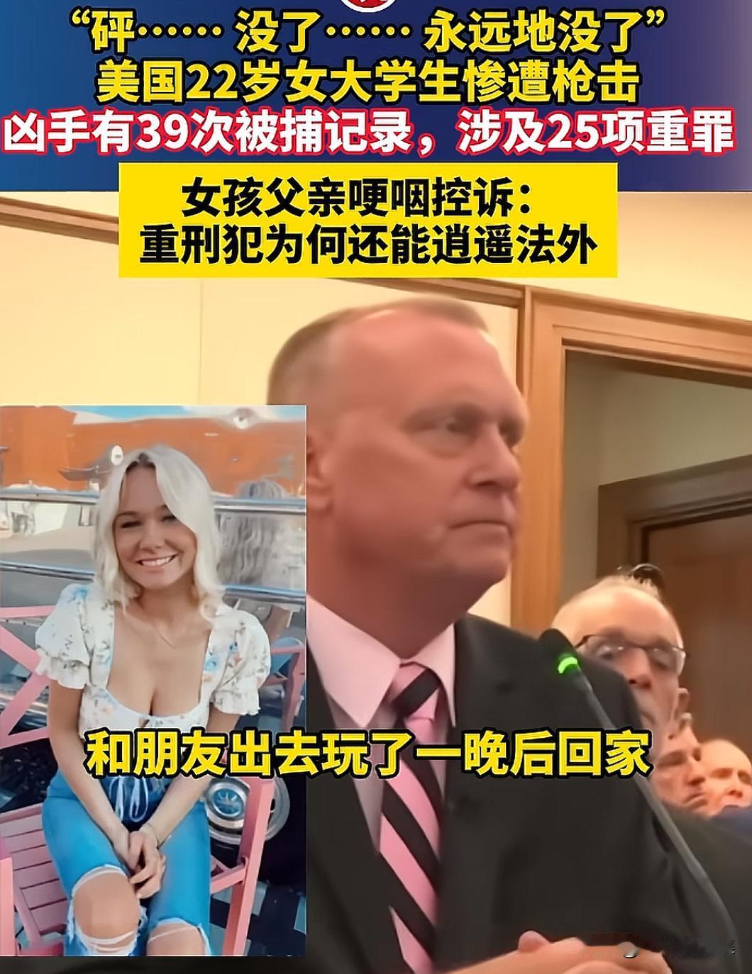 “砰…”的一声,没了…永远的没了!这是M国一位父亲在他22岁的女儿遇害后,在一场听证会上痛苦的发言。他说自己22岁的女儿跟朋友出去玩了一晚后,回到家睡觉,被人一丝不挂的从床上提了起来。她哀求着凶手,请他饶她一命;哭着呼喊“爸爸”,希望他像英雄一样突然出现,救她一命。但是一声Q响之后,她永远的没了!女儿只有160,52公斤,不会对任何人构成威胁,但她还是被凶手残忍的S害了!而这个人,有39次被捕记录、涉及25项重zui。但就是这么一个人,他依然能够自由的跟我们生活在一起。“Why?”因为他交了保释金,因为他被假释。可是这样一个劣迹斑斑、有极度危险的人,为什么会给他假释机会,让他混迹于人群之中?!有如此多重zui在身的凶手基恩(看这名字就知道是个白人),年仅30岁。也就是说犯了那么多zui,被关在J狱的时间却不长。此次受害的不只有他女儿,还有很多家庭被盗,那些偷来的信用卡被大肆消费,造成的损失只能受害者承担!有人问他为什么能够被多次保释?因为被抓的次数越多,需要交的保释金越高,说白了这对某些人来说,是一件有利可图的事。一位网友流言说:在M国,犯任何重zui都可以被原谅,但欠税除外!说的一针见血,真的很讽刺。
