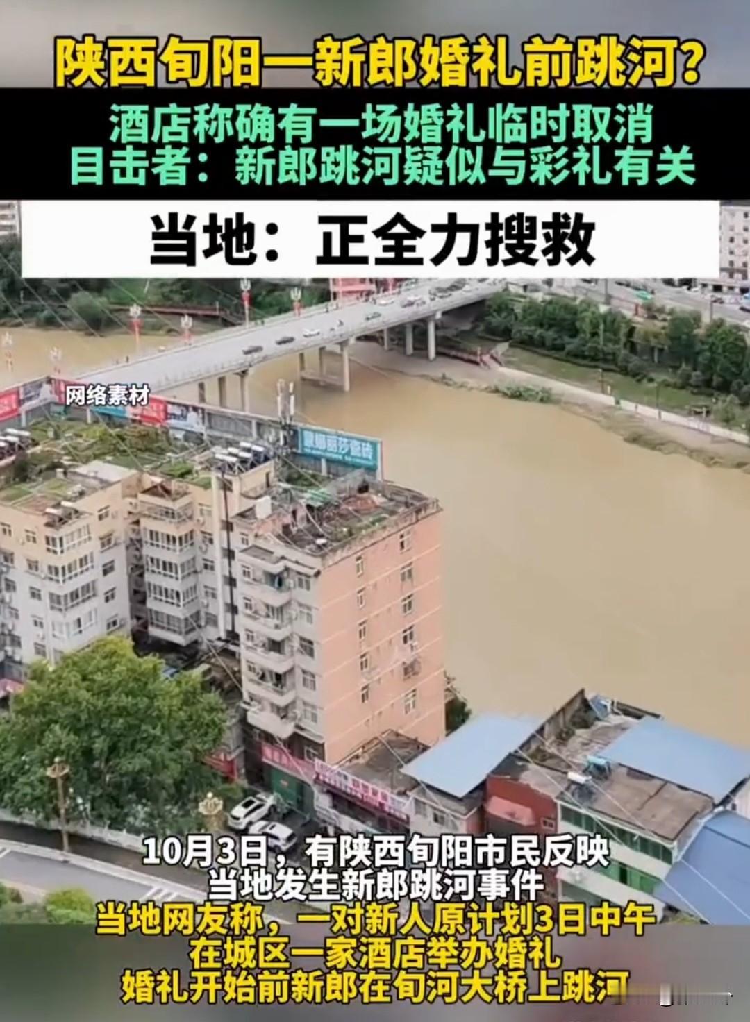 陕西新郎婚礼当天跳河 救援持续进行 10月3日上午11点左右,陕西旬阳一名新郎在婚礼开始前从旬河大桥跳入河中。由于连日降雨,河水深达五六米,水流湍急,新郎被冲走后消失。当地应急、公安、消防等部门迅速展开搜救,但因河水浑浊,救援难度较大,截至4日仍未找到失踪者。 事发酒店确认,原定午间的婚礼已临时取消。据现场商户描述,当时桥上聚集了不少围观群众,有人看到新郎身穿婚礼服装跳河。 关于跳河原因,网络上有说是婚礼当天,新郎已掏空家底付了20万彩礼。新娘下车时突然索要2.2万下车费,新郎拿不出,婚礼当场取消。但旬阳市官方初步调查指出,新郎因“婚礼琐事情绪失控”跳河,具体细节仍在核实中。目前,搜救和家属安抚工作仍在继续。 参考资料:环球网、澎湃新闻、搜狐新闻、网易新闻。