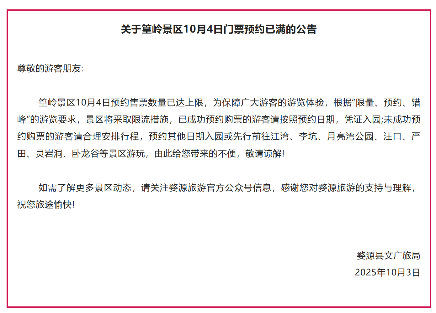 同样在江西上饶市的望仙谷景区10月4日凌晨发布《关于望仙谷景区10月4日门票预约已满的公告》:望仙谷景区10月4日门票预约已达上限,为保障广大游客的游览体验,根据“限量、预约、错峰”的游览要求,景区将采取限流措施,已成功预约购票的游客请按照预约日期凭身份证入园;未成功预约购票的游客请合理安排行程,预约其他日期入园。