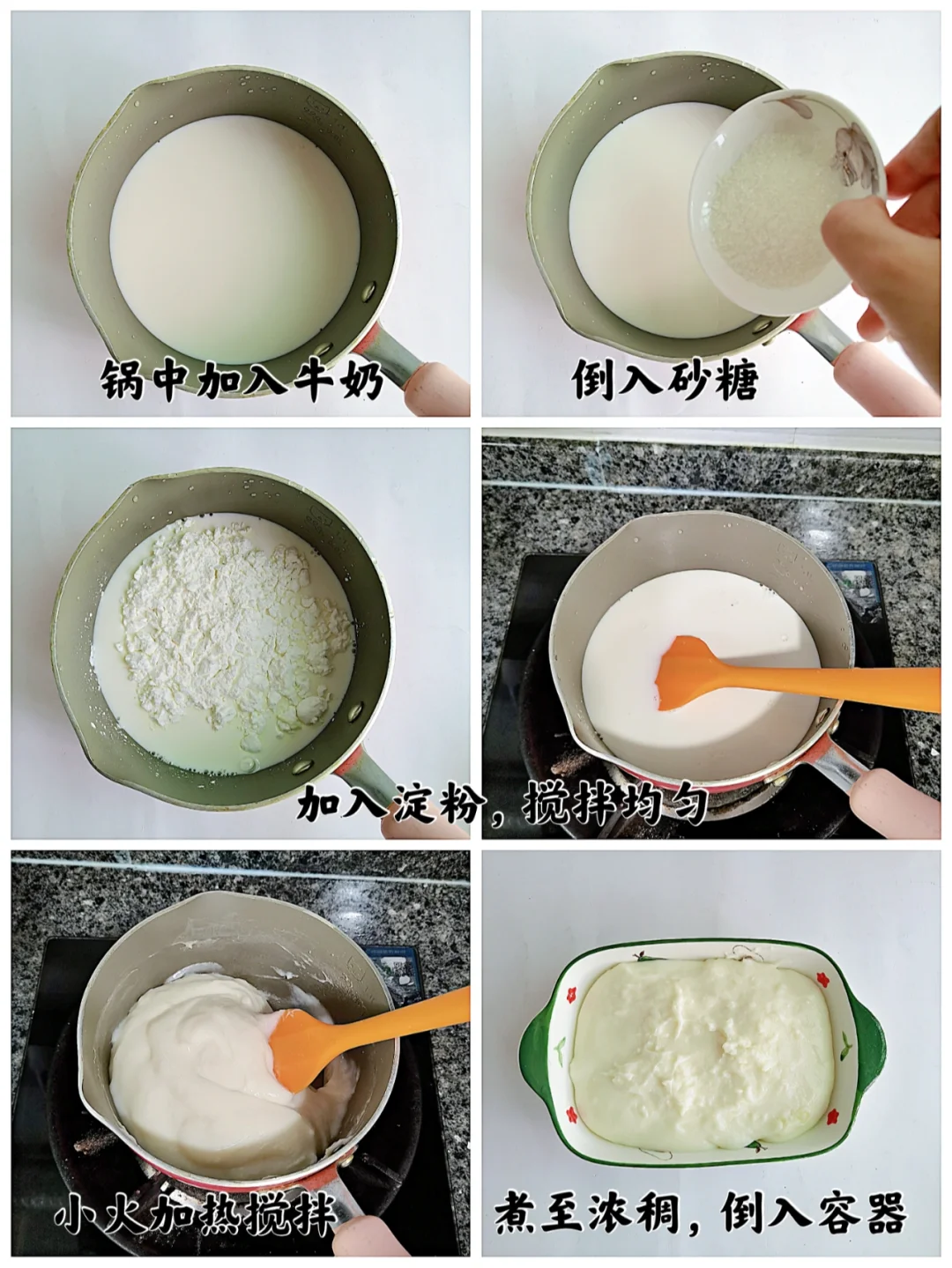 食材:牛奶400克,玉米淀粉60克,白砂糖10—20克