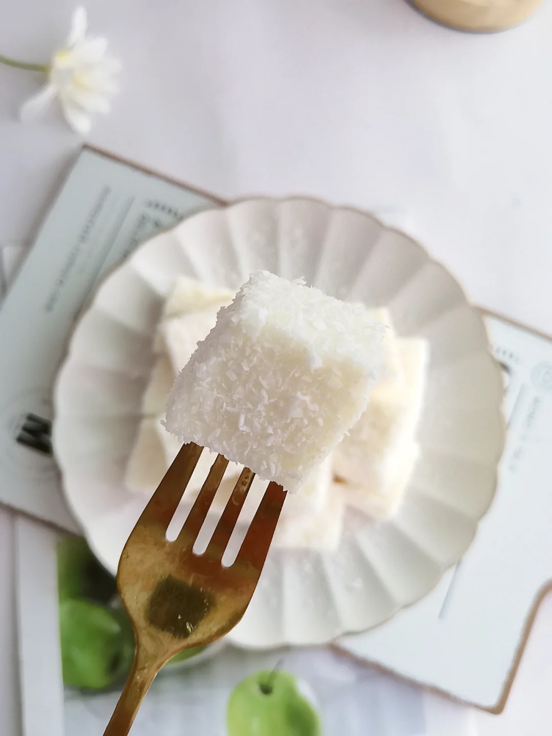 3⃣.冷藏1-2小时后,脱模切块,再裹满椰蓉就可以吃啦!