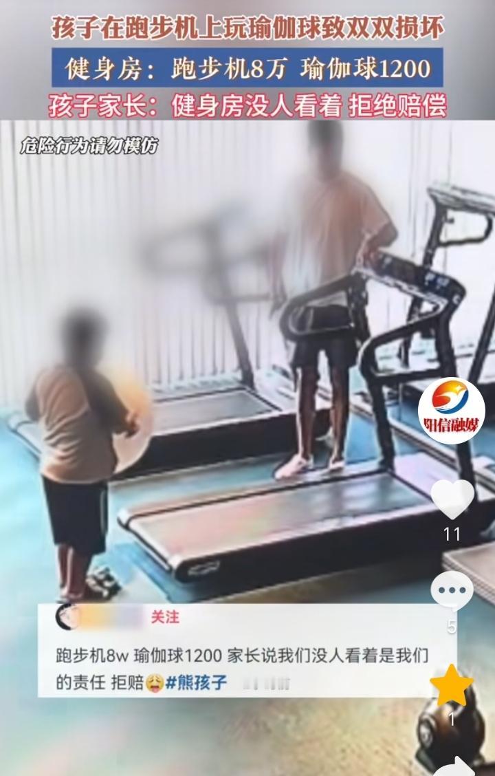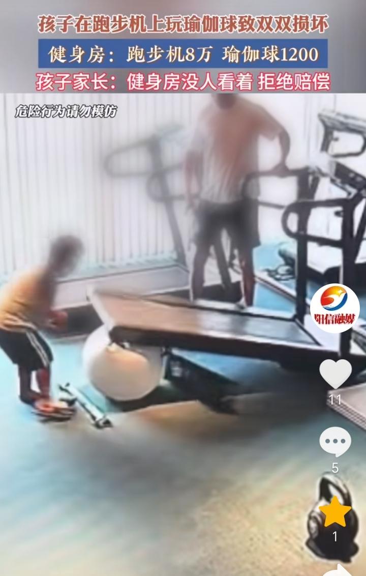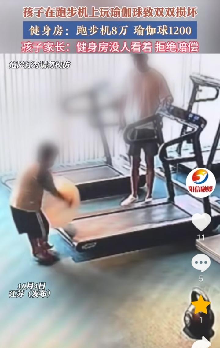 这不是索赔而是宰人!江苏,小孩在跑步机上玩瑜伽球,结果双双损坏,健身房要求赔偿。 据阳信融媒报道,10月4日江苏,一小孩在健身房的跑步机上玩瑜伽球,结果不仅损坏了跑步机,而且瑜伽球也被压坏,对此,健身房要求小孩家长赔偿,跑步机8万元,瑜伽球1200元,孩子家长拒绝赔偿,理由是健身房没有人看着。 小孩子本来也就贪玩,不过损坏了东西理应赔偿,但是跑步机8万元,瑜伽球1200元,明显有些狮子大开口了,这价格就不是索赔,而是宰人了。 现在这些运动器材价格网上都有,一查就能知道,健身房也是想把别人当做傻子,让赔偿就应该报出合理价格,如果孩子家长扔拒绝赔偿,那就只能走法律程序,最终法院会公平断定。 作为家长一定要看护教育好自己的孩子,万一孩子在外面惹祸,最终还是需要家长来赔偿。