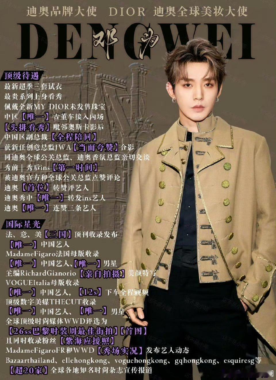 邓为巴黎时装周dior大秀战报来了,连续两年参加巴黎时装周,外网声量打破中国限定,待遇一次比一次好,各国权威杂志+媒体报道,甚至还带着💎一起登上了WWD最佳街拍首图!🐮