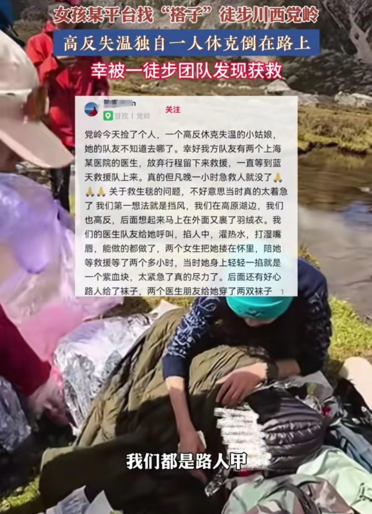 要是没遇到这两位从医的女士,小命就得撂在党岭上。 失温急救需要非常专业的操作,是不能极速供热的,喂热水、烤火都不行。 幸亏在好心人的帮助下,女孩被救了回来。 她是从网上找的“搭子”一同徒步川西党岭,但被发现时只有她一个人。 如果搭子是见她失温还丢下她一人,好像还要担责。 反正这是一次不成功的徒步之旅,但好在有惊无险。