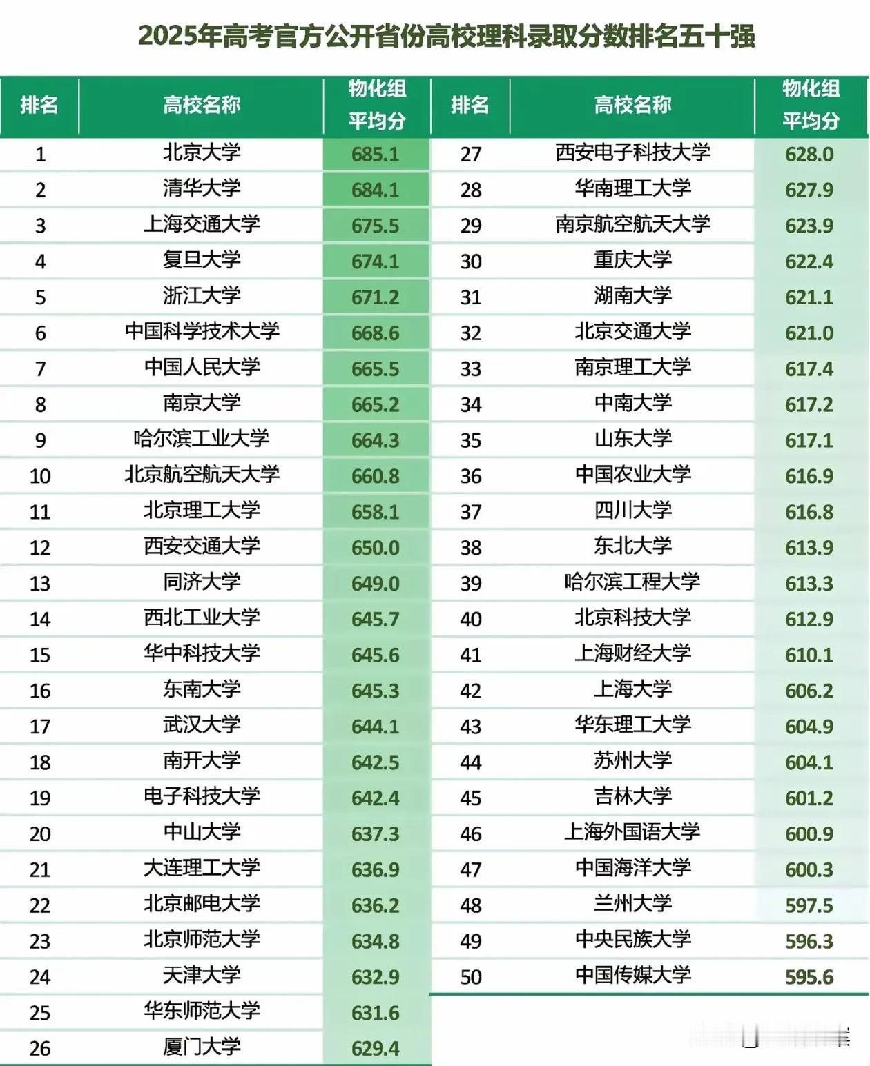 2025年高考,全国理科录取平均分前50名的高校名单。吉林大学和兰州大学这两个老