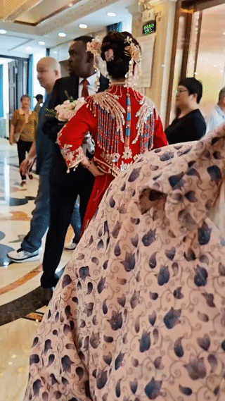 网友在一家酒店内意外偶遇一对正在这里举办婚礼的中非情侣。 新人长得很漂亮,而新郎