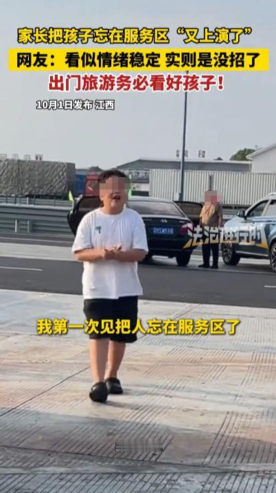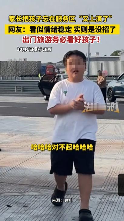 “离了个大谱!”10月1日,江西,一男孩被粗心家长遗忘在了服务区,家长意识到后火速开车回去接,男孩情绪特别稳定,一边拍手一边平静吐槽着,网友:小孩哥看似情绪稳定,实则是没招了! 家长将自己孩子落在服务区的事情可太常见了,可还是有些“马大哈”不从中总结经验教训,在服务区休整完,不检查出行人员全不全就将车开走。 一男孩十一假期和家长出门旅游,途中经过一个服务区时一家人下车休息,谁知,休息完后粗心的家长直接开车上路,被留在服务区的男孩只能眼睁睁看爸妈把车开走。 车已经开出去一段时间了,家长突然意识到自家儿子没上车,被落在了服务区,吓得赶紧将车开回去找孩子。 此时,男孩正在路边等待,焦急地看着远处的车辆,等待爸妈能想起来他们还有个孩子落在服务区,不一会儿,粗心的家长赶回了服务区,找到了自己的儿子。 男孩看到爸妈来后,没有哭闹,反而还十分淡定,他一脸无语,一边拍手鼓掌一边“称赞”自己爸妈的行为,家长看到这一幕笑得合不拢嘴,不断给儿子道歉。 不少网友觉得男孩淡定是因为确实没招了,家长带孩子出远门时一定要看好,不要存心将自家孩子落在服务区,一旦发生意外,后悔都来不及! 信息来源:《家长把孩子忘在服务区“又上演了” 网友:看似情绪稳定 实则是没招了 出门旅游务必看好孩子!》法治进行时