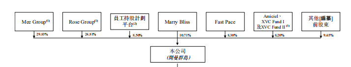 MarryBliss(蓝驰星合)持股10.71%、小米集团通过FastPace持股8.30%、Amiciel、XVCFundI及XVCFundII持股8.20%、其他前股东持股9.65%。