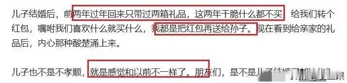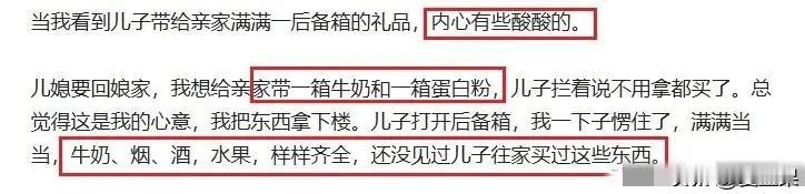 今年假期是双节,八月十六闺女要回娘家看望父母。 有没有婆婆看见儿媳妇买礼物回娘家不高兴的? 当然有,看到儿子儿媳妇往后备箱大箱小箱的礼物提,心里别提多别扭了。 有的婆婆貌似精明,从屋里拿出来两箱奶或者饮料说,家里有,你们也不用买了。 言外之意就是这些东西回娘家就行,别再买其他东西了。 事实上,儿媳妇会听吗?不会,照样还是买,一年回不了几趟,还嫌这些礼物寒酸呢。聪明的媳妇会背着婆婆买,聪明的女婿替着买,不过还有傻傻的女婿跟婆婆一样貌似精明,啥也不买,觉着人跟着去就可以。 可能婆婆们都会有酸楚,辛苦养大的儿子光孝顺丈母娘,自己帮助做饭带孩子,没功劳也有苦劳,他丈母娘干啥了? 怎么说呢,这跟传统有关,因为儿媳妇进了你家的门成了你家的人,生的孩子跟了你们的姓。早晚在你们身边待着。 如果想平衡反过来也行,入赘女方,让儿子跟丈母娘家过,孩子跟女方姓,这样,逢年过节就不用看望丈母娘了,换成回去看望公婆了。儿子觉着瞧自己的爹娘,肯定也大方。这样婆家肯定不干,至少绝大多数不同意。 所以就别有意见了,人家一年也瞧不几趟娘,何必呢?白给自己平添烦恼。