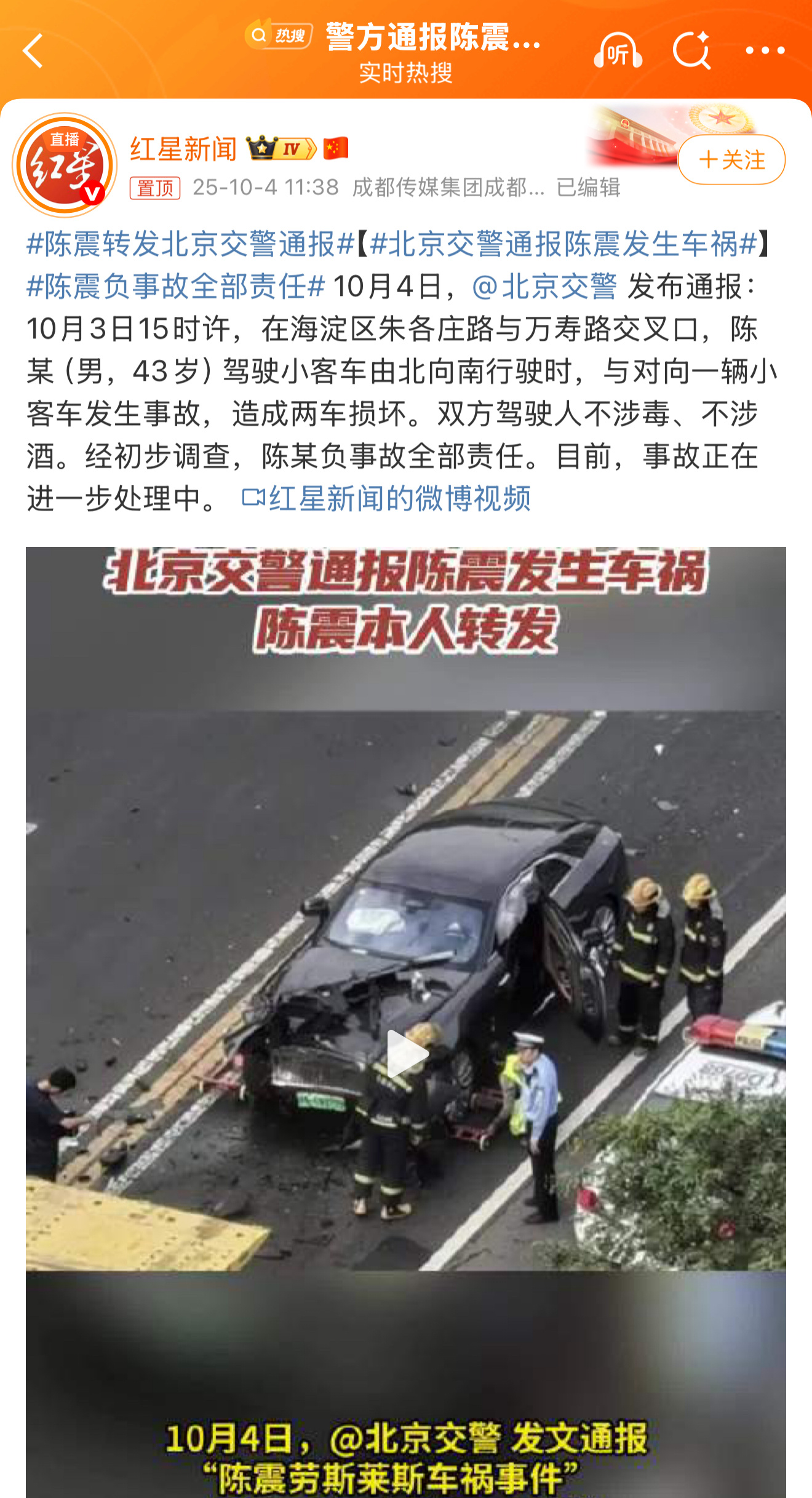 北京交警通报陈震发生车祸,陈某全责,这种事故只要不涉及到销户,就只有赔偿责任,这些损失对顶流来说不算太多,所以有些阴阳怪气的就没必要了[允悲]可能就跟你撞了一个没商业险的比亚迪一样,我们普通人还是尽量全险,起码你得买三者险。