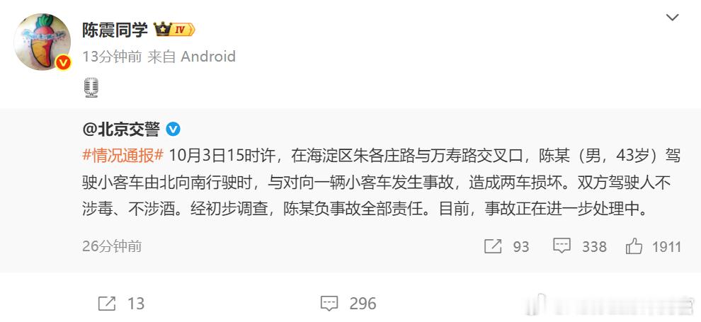 陈震车祸事件不涉及毒驾醉驾 北京交警通报陈震发生车祸 陈震负事故全部责任