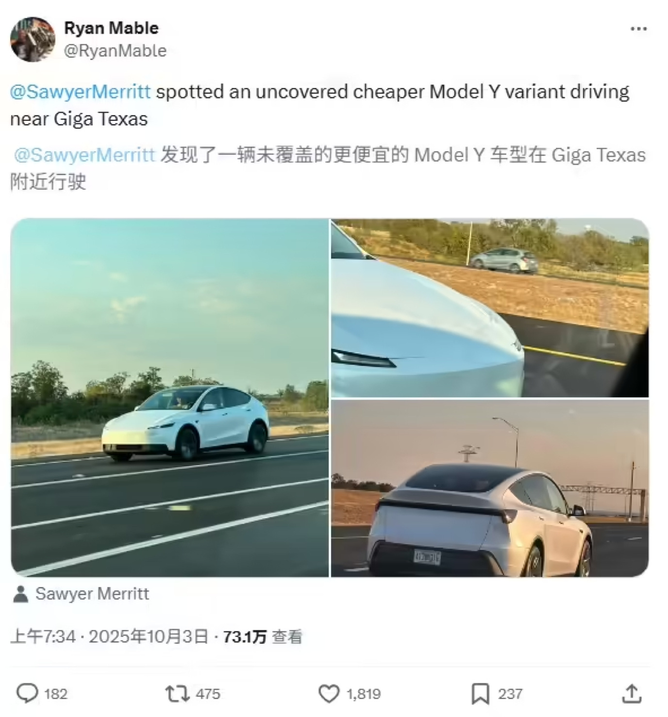 据谍照拍摄者介绍,拍摄地点位于得克萨斯州 130 号公路上,新车大小看起来与现款 Model Y 基本一致。