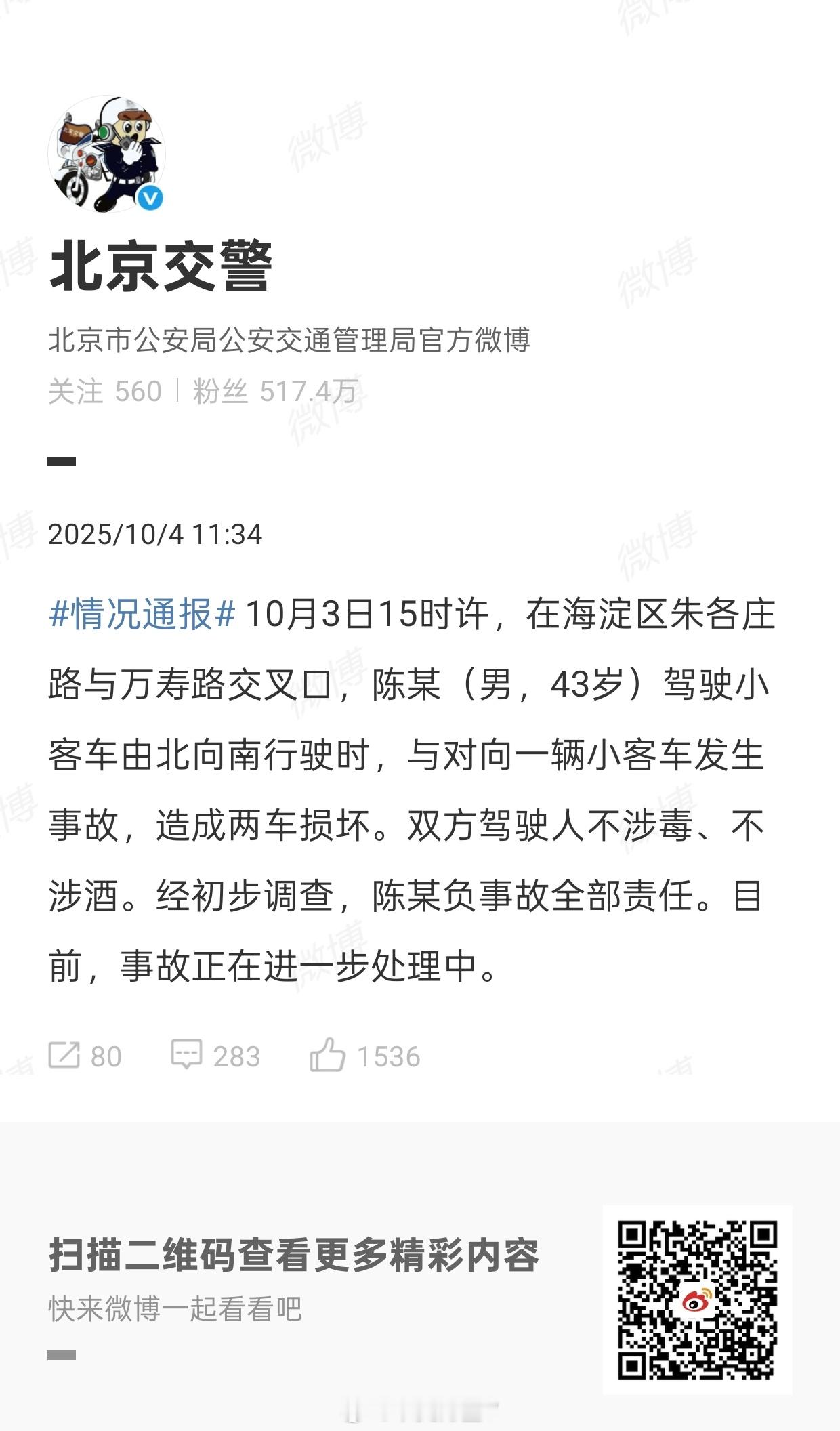 北京交警通报陈震发生车祸不涉毒,不涉酒,陈某全责。[doge]热点观点