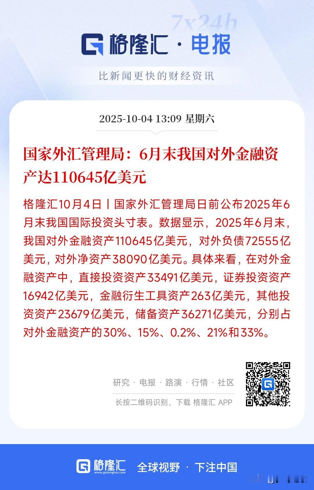 中国人还是很有钱的,只不过花在了外面,多数用于了投资 前半年我国对外投资11万亿美元,净投资3.8万亿美元投资。 数据显示 ,根据国家外汇管理局公布的数据,2024年6月末,我国对外金融资产为9.8亿美元。 也就是说仅仅又对外投资追加了2.2万亿美元,疯狂的购置国外资产,其中证券投资增加的最多,由1.2万亿美元增加到了1.6万亿美元,主要还是人工智能突然的崛起,迫使全球资产疯狂追逐科技公司。 2025年上半年,境外对境内证券投资净流入373亿美元,远远小于中国对外的投资额度。