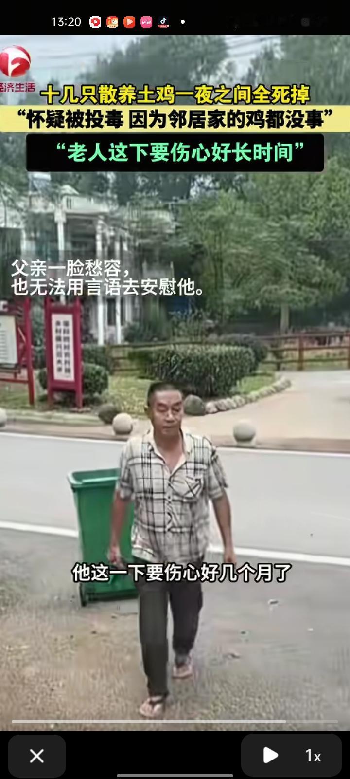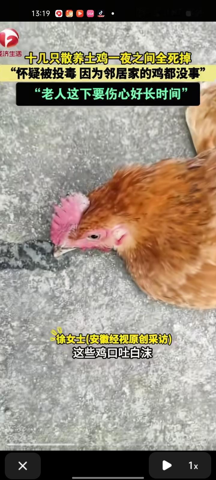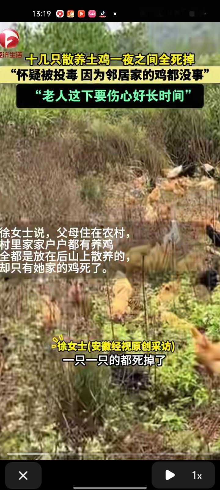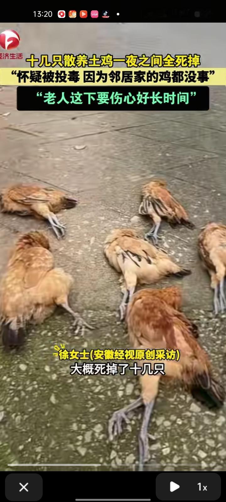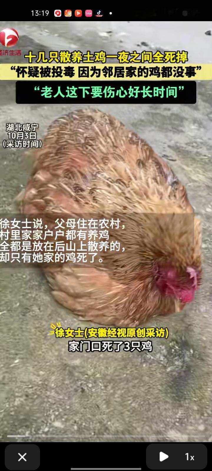 9月29日,湖北咸宁。女子发视频表示,十几只散养的土鸡一夜之间全死掉,口吐白沫,怀疑是邻居投的毒,因为只有邻居家的鸡没事。当时老父亲一个人住家里,平时自己舍不得吃,攒的鸡蛋也要给她留着,他估计要伤心很长时间了。