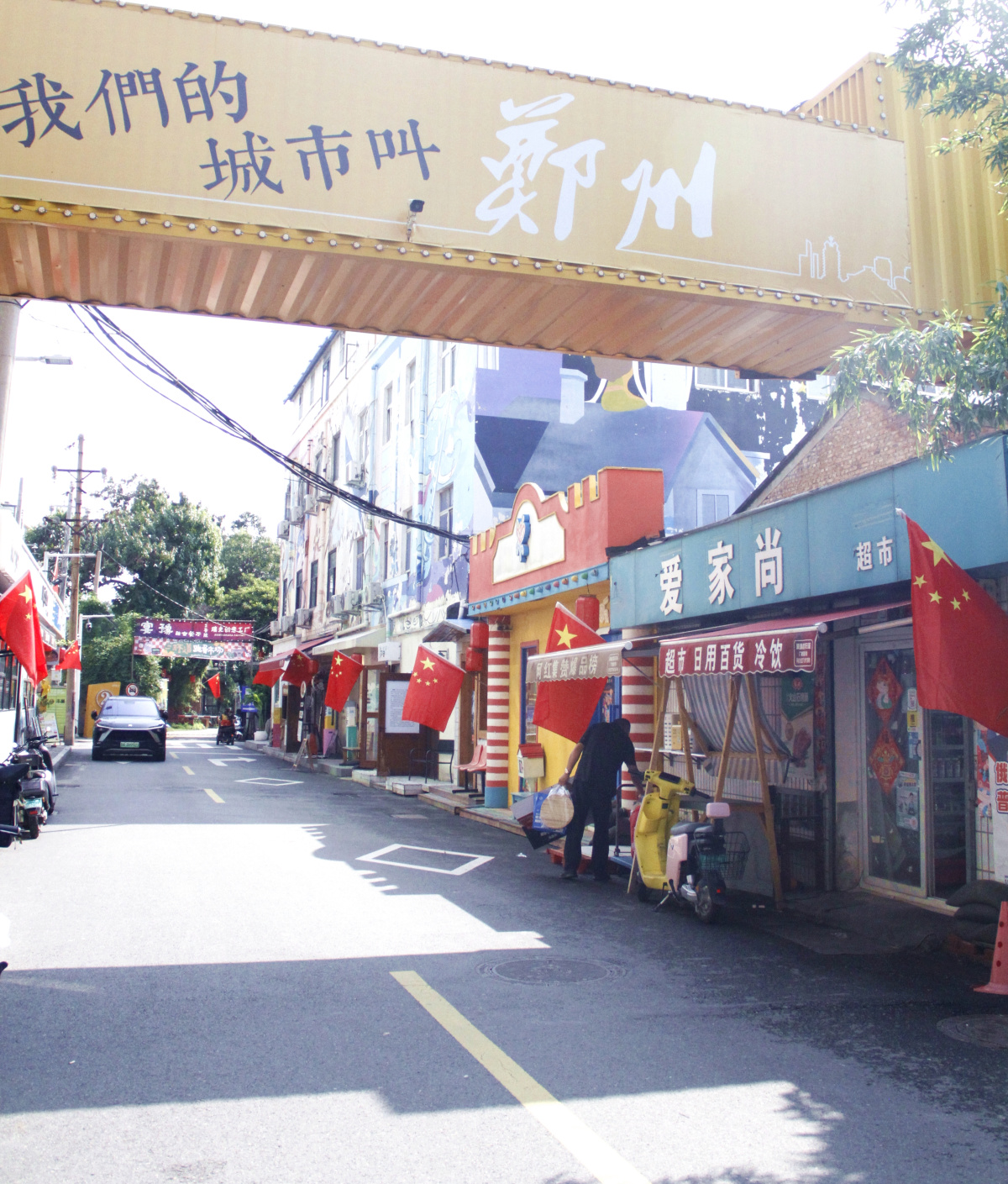 嵩山路与陇海路口,“我们的城市叫郑州”主题与绿化绿植、爱国元素融合。过往行人在绿意盎然中邂逅“中国红”,既感受到城市的生态之美,又被浓厚的国庆氛围感染,家国情怀与对城市的热爱在此刻同频共振。