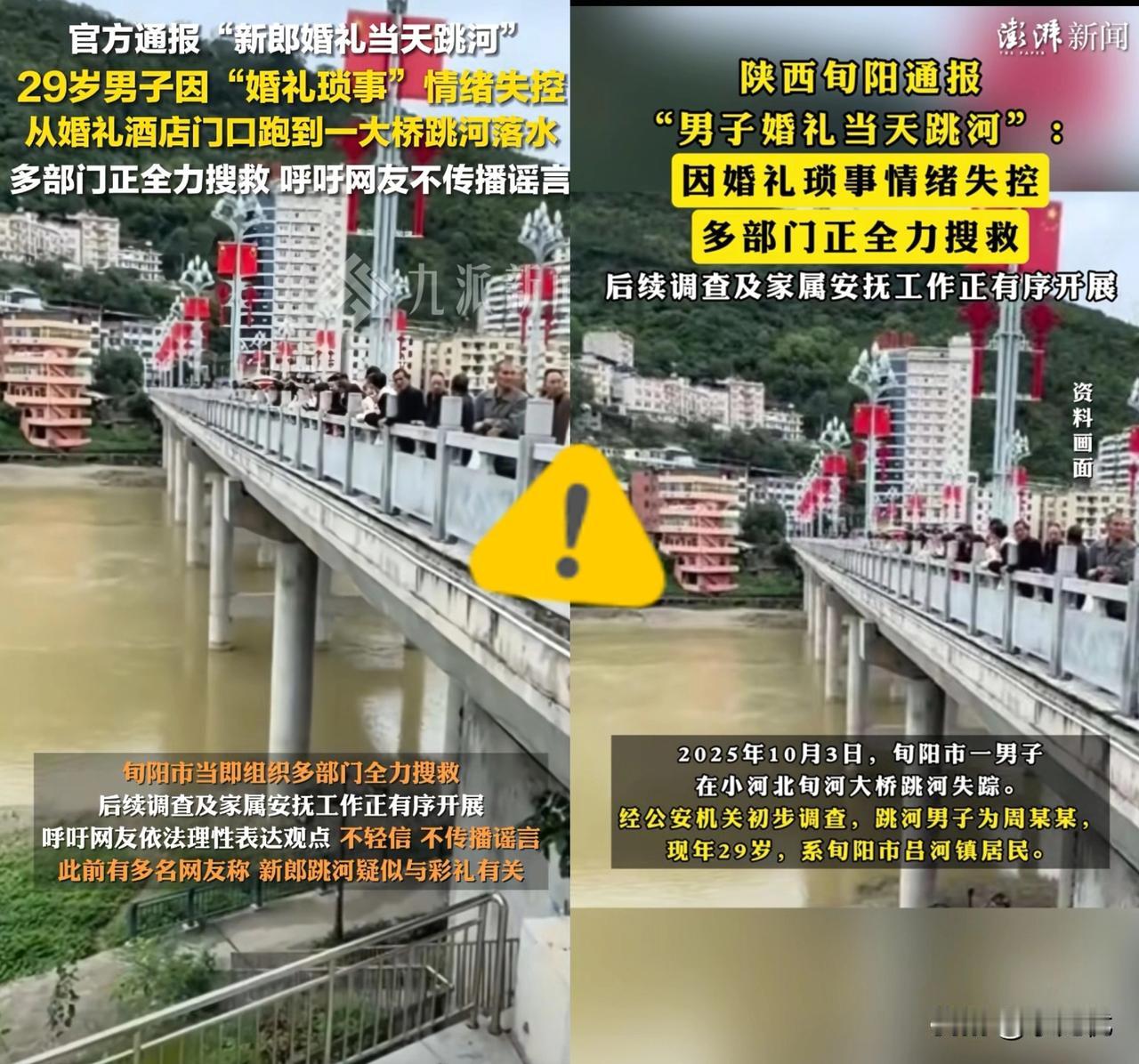 结婚本是奔着团圆的喜事,陕西旬阳这场婚礼却成了天人永隔的悲剧,真的太让人揪心了! 29岁的新郎周某某,掏空家底凑了20万彩礼,酒店布置好了,亲友也到齐了,就等接新娘进门。可临门一脚,女方突然要2万下车费,说不给就不下车!他好话说尽也没用,看着满场等待的宾客,想到家里早已见底的积蓄,彻底崩了! 从酒店门口疯跑到旬河大桥,他纵身跳了下去。浑浊的河水有五六米深,只冒了下头就没了踪影。搜救还在继续,可希望越来越渺茫,网传他母亲差点跟着跳河,幸好被拉住了。 别再骂新郎冲动、怪新娘物质了,真正该怪的是把婚姻当交易的陋习。彩礼从心意变成门槛,感情在钱面前变得不值钱,才逼得人走投无路。 这场悲剧该敲醒多少人?如果是你遇到这种临时加价,会怎么选? 若有筹备婚礼的压力你会选择怎样的宣泄方式