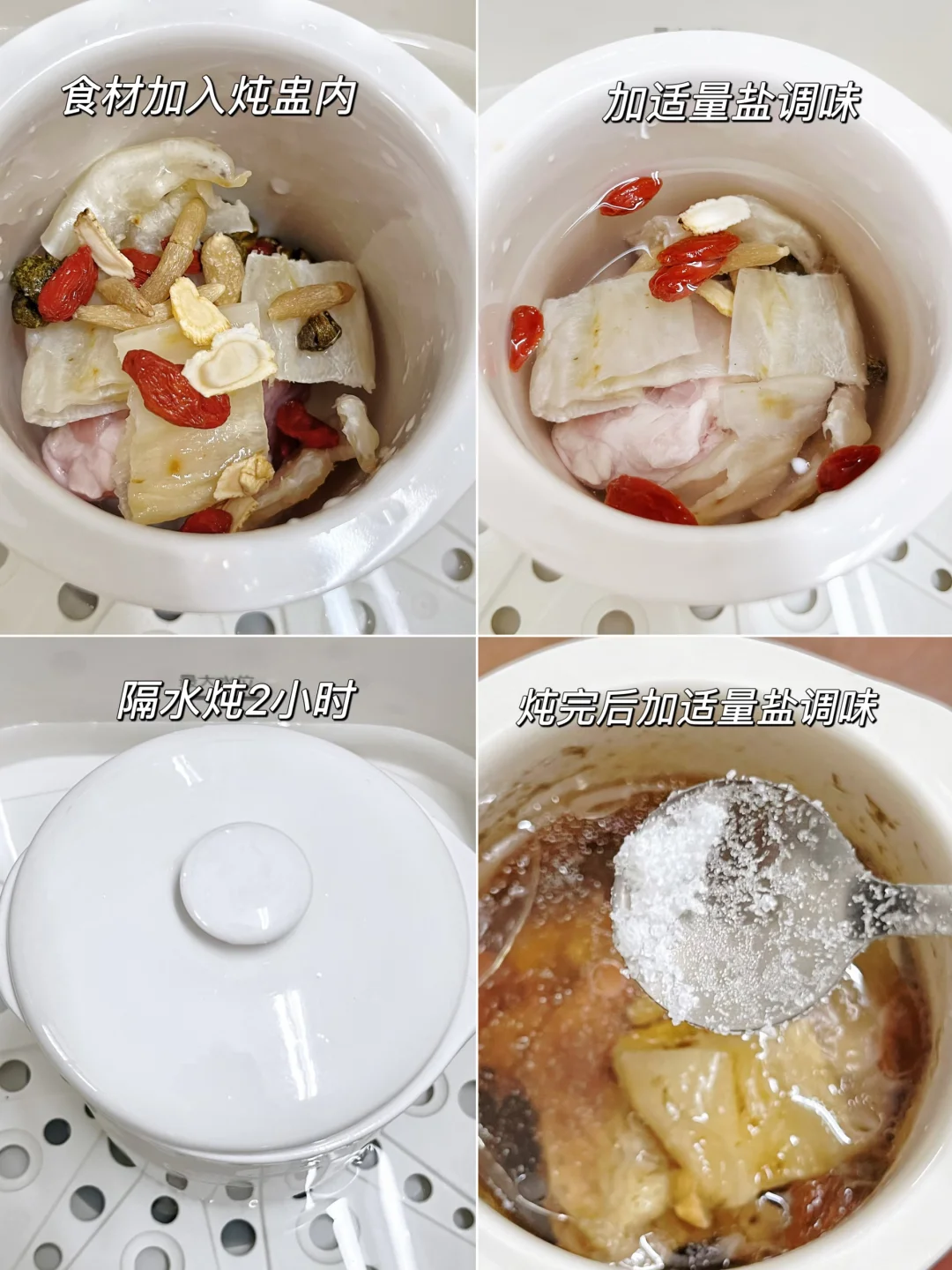 所有食材加入炖锅内,隔水炖2小时,炖完后加适量盐调味。