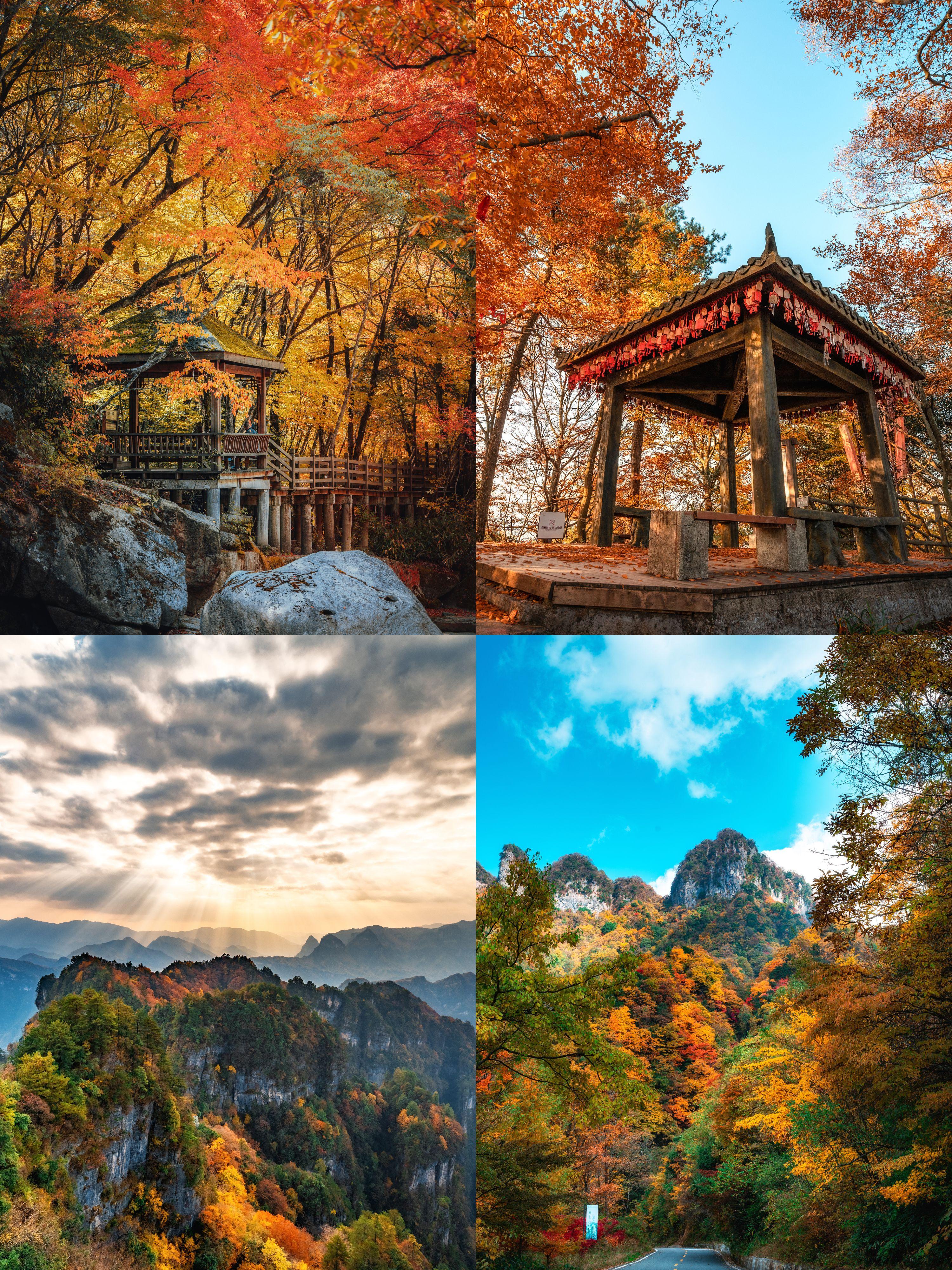 被誉为亚洲最长红地毯,红叶面积达680平方公里,40余树种(巴山水青冈、枫树、黄栌等)形成红、橙、黄、紫交织的立体画卷