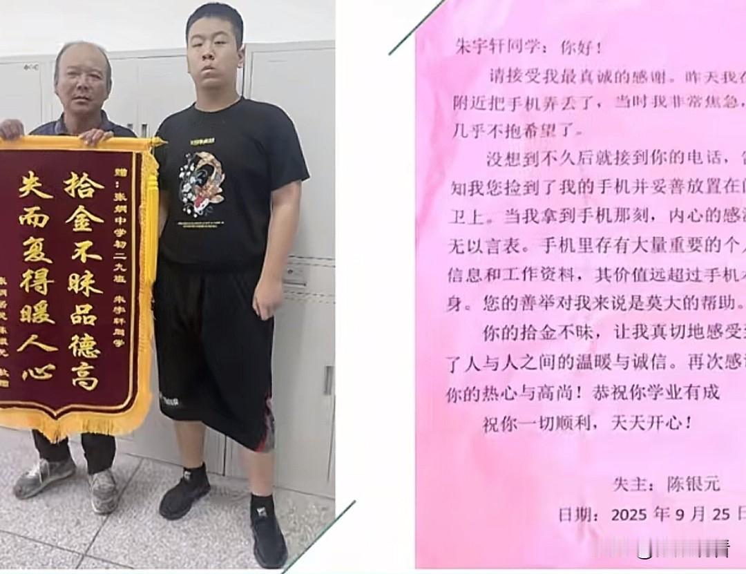 拾金不昧,是一种修养,更是一种力量。近日,扬州市江都区张纲中学的朱宇轩同学,捡到手机后第一时间联系失主并归还,用行动诠释了诚信与担当,收获了失主送来的锦旗和感谢信。 我们耍了为朱宇轩同学点赞!也为张纲中学的德育成果点赞!让我们一起,向榜样学习,让文明成为校园最美的风景。