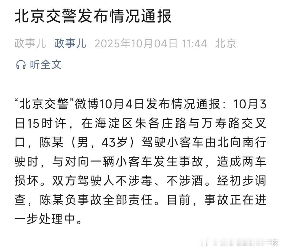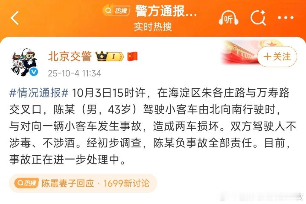 北京交警通报陈震发生车祸北京交警通报:陈某负全部责任!热点现场