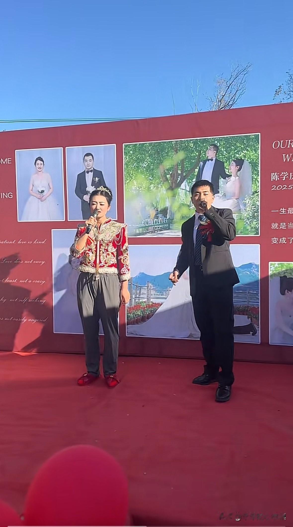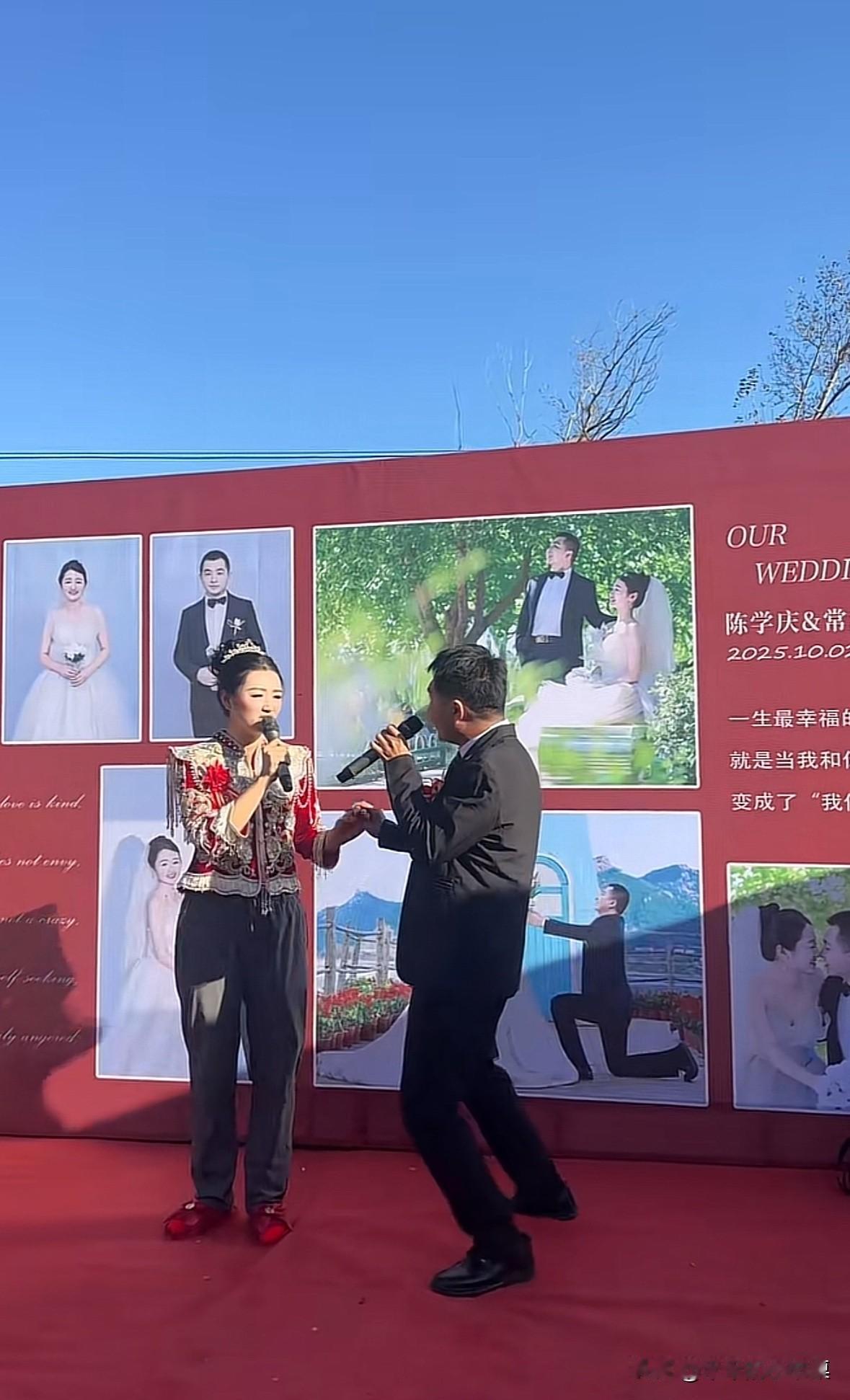 这结婚也太草率了吧!新娘连个裤子都没有! 新郎和新娘还大秀才艺,合唱花好月圆,跑调跑的连原唱都得仔细听才知道唱的啥。 但是新郎沉醉其中,无法自拔。 评论区:“上身基础,下身就不基础!” 好歹是个婚礼,女人一生最美丽的时刻,好歹给搭配一身啊!婚礼现场