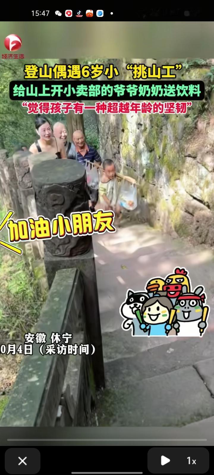 10月1日,黄山市休宁县。女子发视频称,登齐云山途中遇到六岁“小挑山工”,给山上开小卖部的爷爷送饮料,觉得孩子有一种超越年龄的坚韧,这份偶遇对自己登山途中有着最动人的收获。