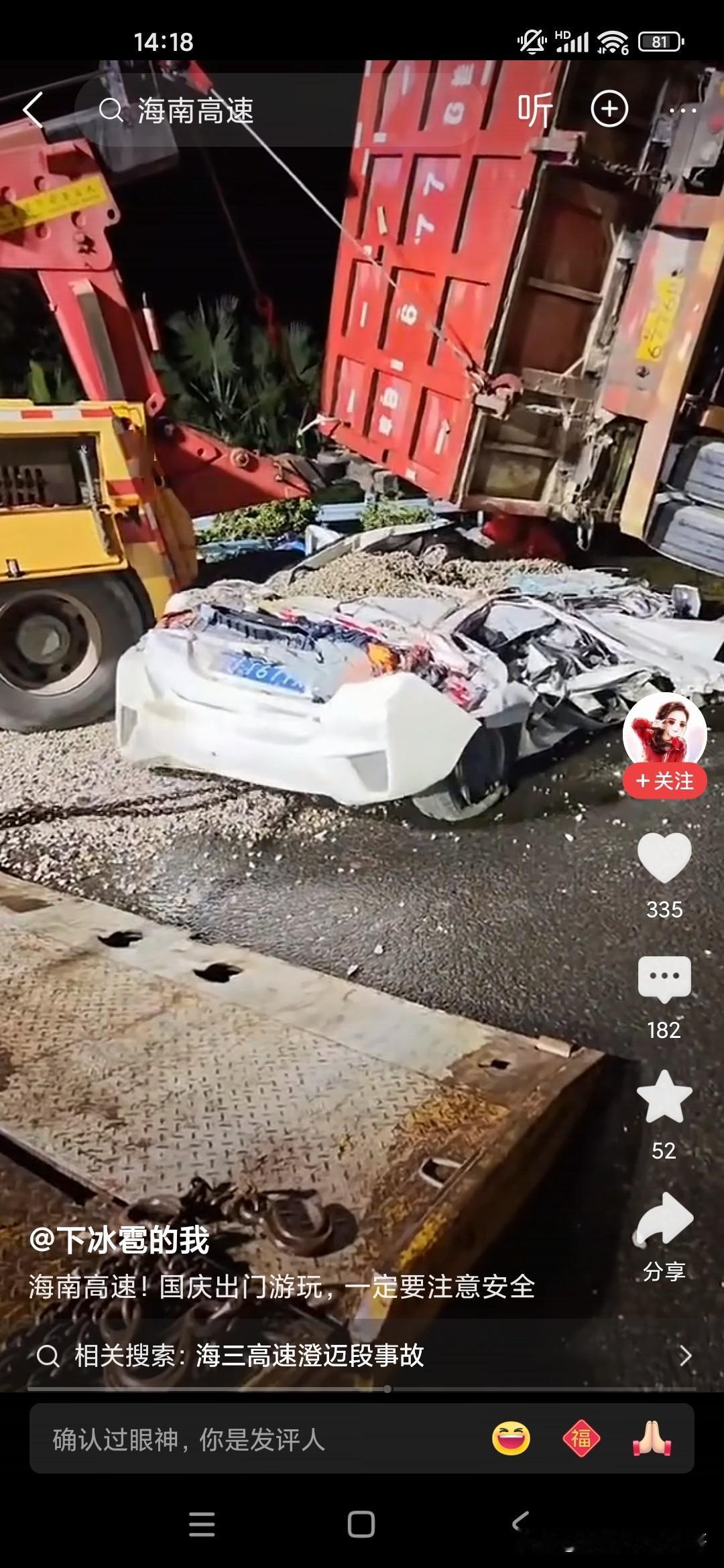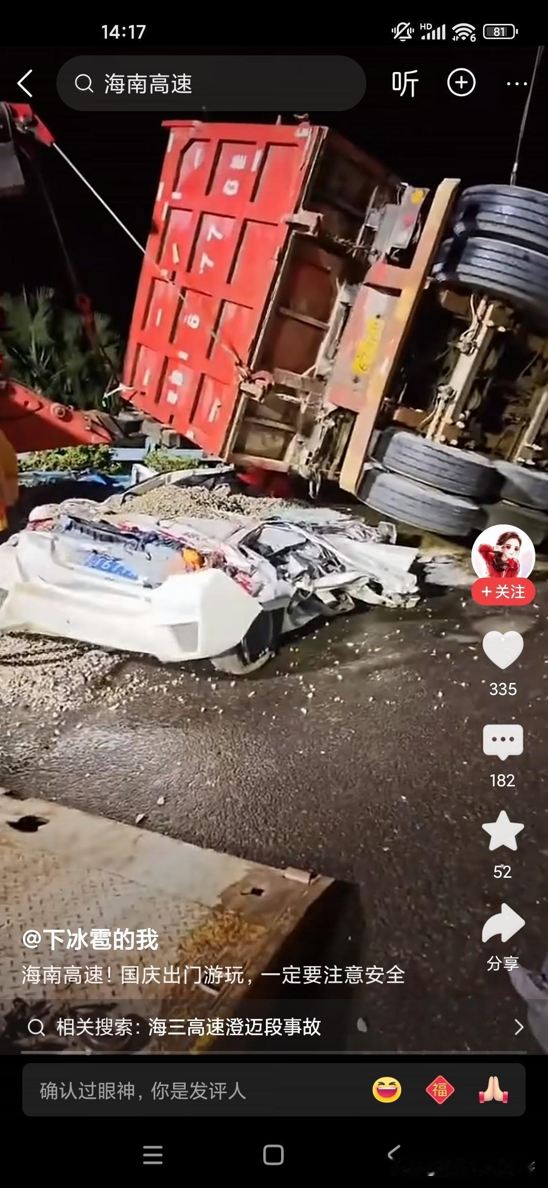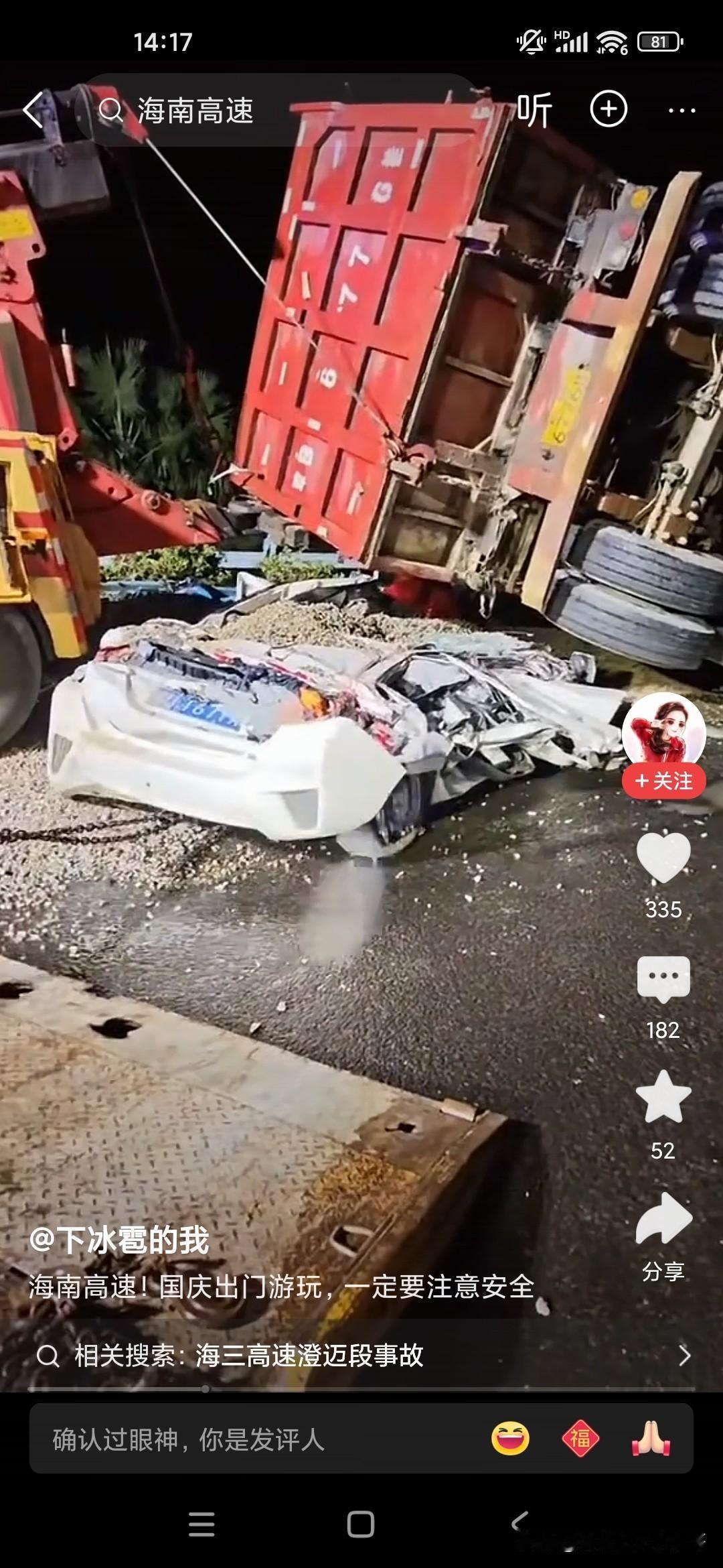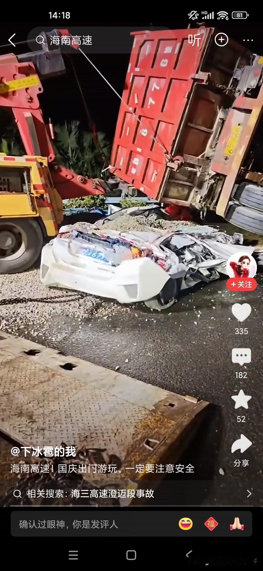 这一家人绝对是完了,刚才看到一场车祸的新闻,心里五味杂陈,论说国庆期间是双节,是国家的生日,又是中秋节,全家团圆的日子,很多人都是拖家带口一起出去旅游或者是回家团聚的,但是却没有想到却遭此车祸,他的车都几乎被压成肉饼了,压成肉夹馍了,你想想里边儿还会有生命存在吗?几乎是不可能的了,路过的人看都不敢看,尤其是小孩子,因为现状惨不忍睹,驾驶位副驾包括后座几乎都压扁了,根本都看不到方向盘,只能看见车轱辘,上面的话几乎都压平了,你想想这车库有多么惨烈,尤其是大货车上路几乎是要人的命啊,是不是?大家开车的话一定要谨慎,尽量不跟或者是远远超过大货车,不要和大货车并排,危险,太危险了!