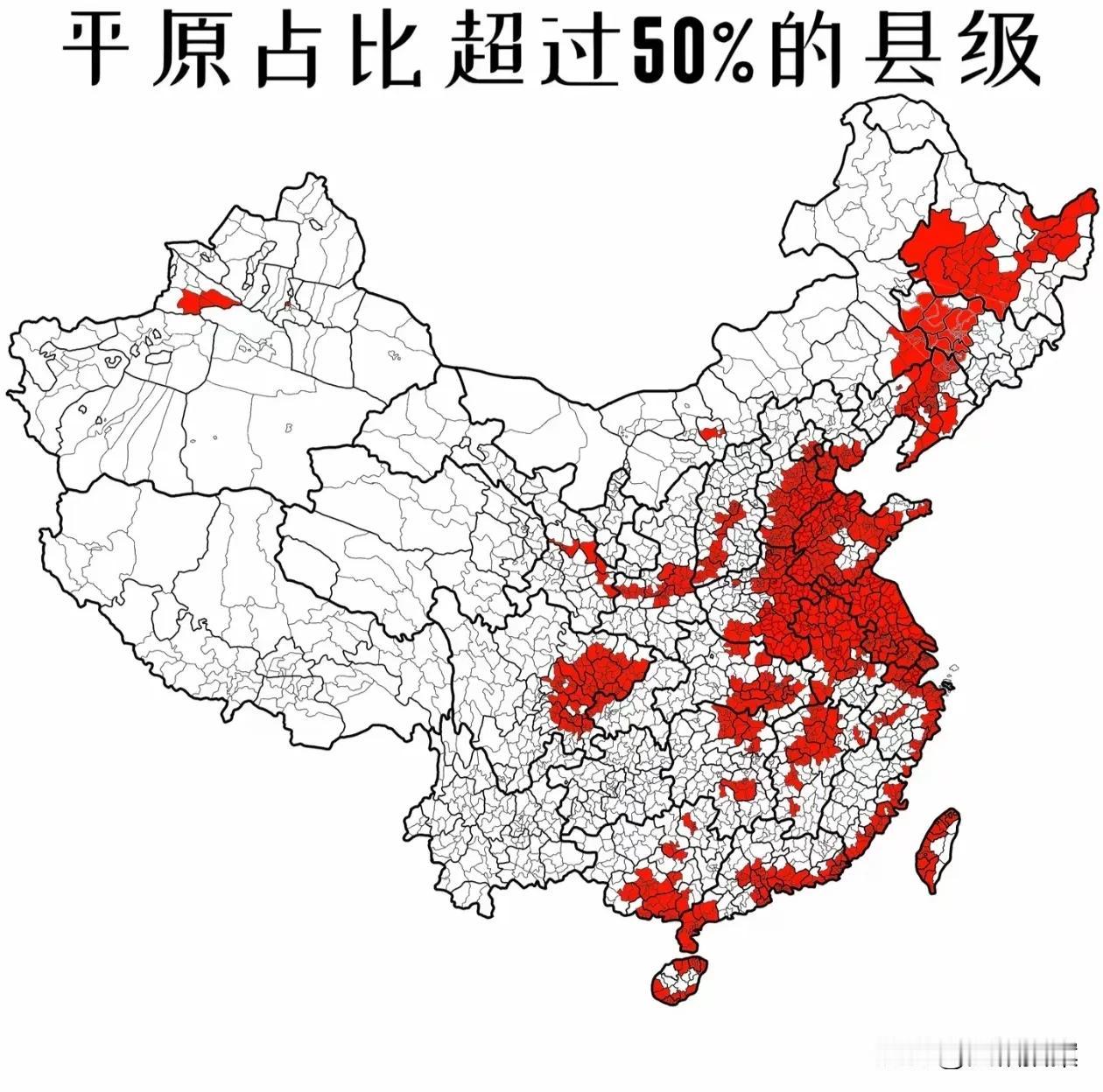 我国平原面积占比超过50%的县级行政区分布图,主要集中于华北平原、东北平原、成都平原、长江中下游平原还有沿海诸平原。除此之外,全国绝大部分县级行政区的平原占比,没有超过一半。 虽然现在的交通工具能突破地理阻隔,但是平原依然是最适宜人类居住和发展的地形。最起码一点,在平原上搞建设的成本要远低于其他地形。地形图