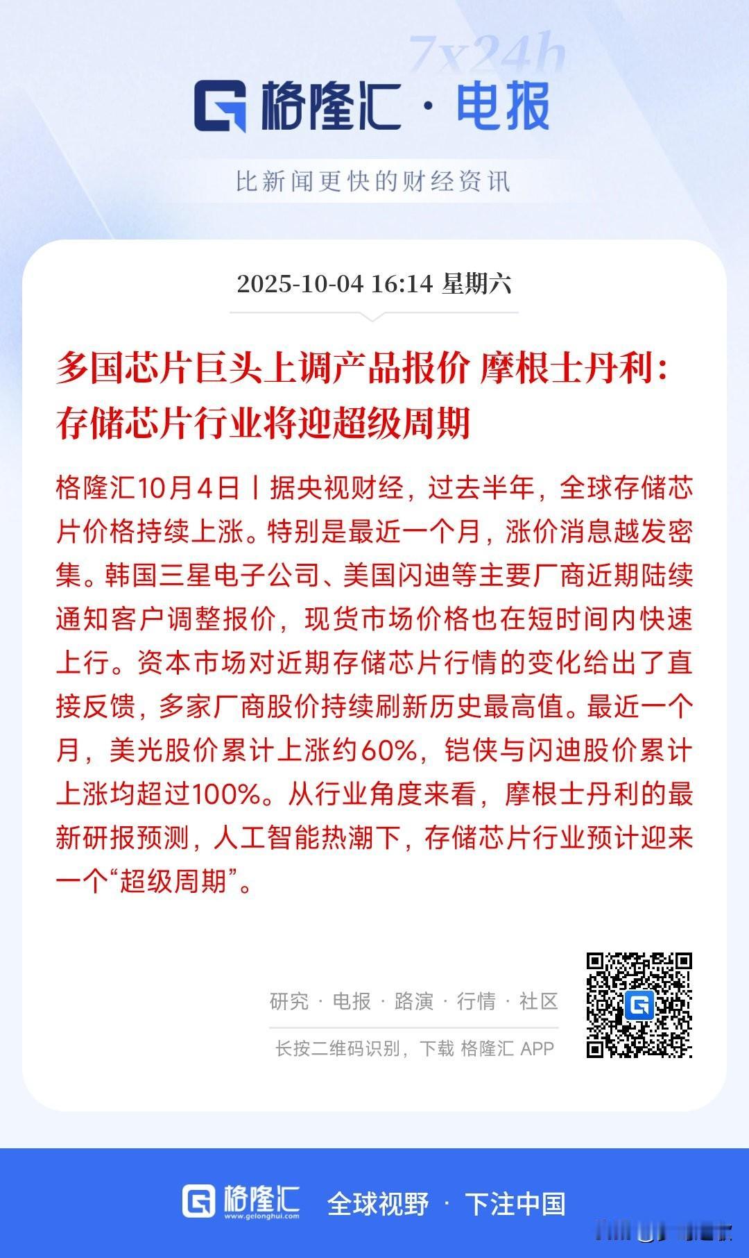 存储芯片的超级周期来了,存储芯片相关产业链迎来重磅利好 最近一个月,存储芯片迎来了一个缺货周期,不出意外的,国内国外的存储芯片厂商都开始进行了涨价的情况。 国外大机构预测存储芯片会迎来新一轮的爆发,因为各国都在对人工智能进行研发,存储芯片将会和算力芯片一样,成为科技领域不可或缺的一环。 今年存储芯片A股的公司已经涨了60.68%,很多公司都已经翻倍了,但从行业的景气度看,未来存储芯片还会有新一轮的上升空间。
