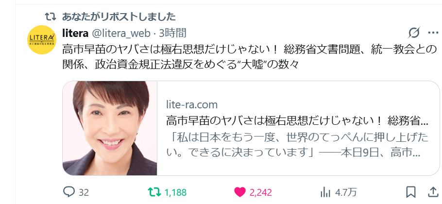 此人极度右翼,与统一教会有牵扯,政治资金违规操作,等等等等,真就黑料身上长了个人
