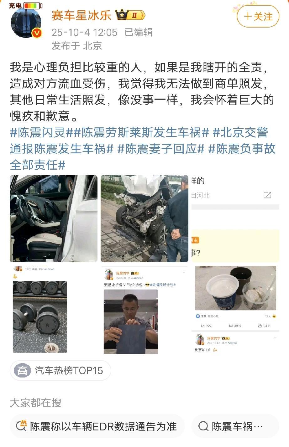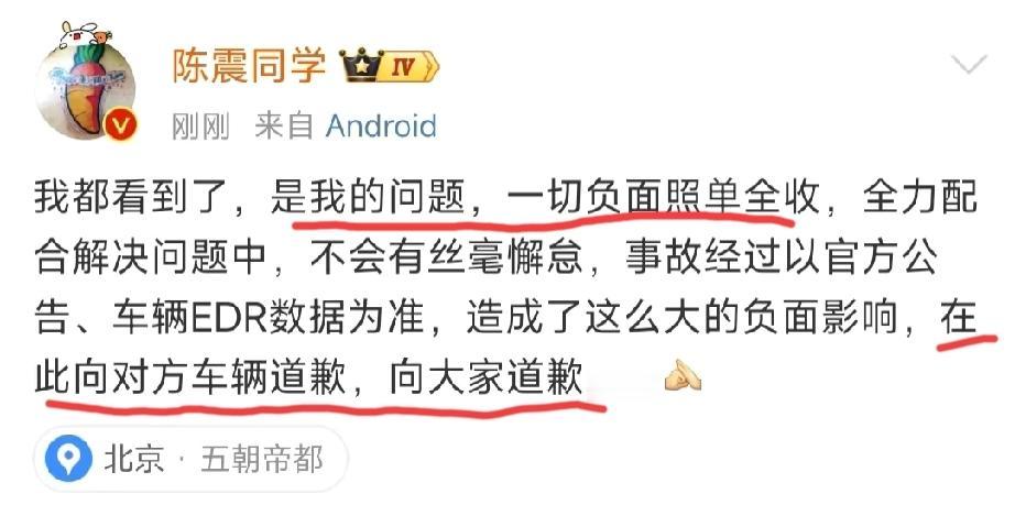 刚刚,陈震同学道歉了:是我的问题,一切负面照单全收,向对方车辆道歉,向大家道歉。