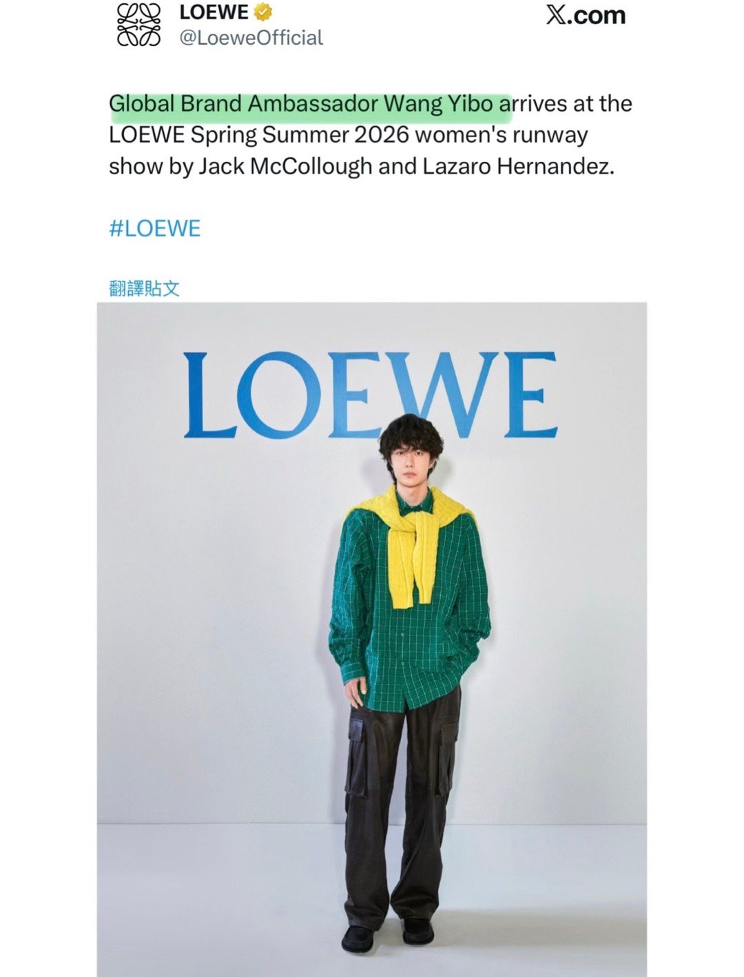 罗意威官方发布全球代言人王一博,外网首位认领,中国顶级巨星的排面。