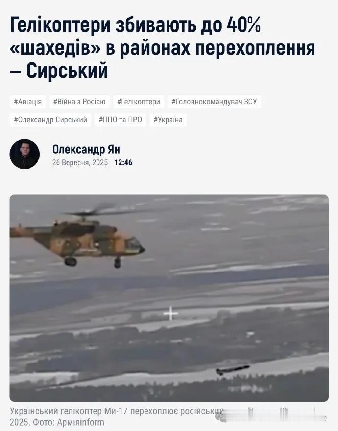 直升机在乌克兰防空拦截作战中发挥了重要作用,乌军总司令西尔斯基称,“根据天气情况,我们的直升机有时会在其任务区域击落高达40%的无人机,因此,我们也在加大这方面的投入。”