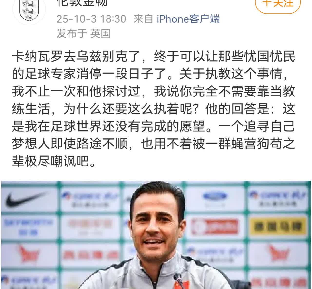 【足球经纪人金畅暗讽中国球迷?】 卡纳瓦罗要去执教乌兹别克斯坦了,对于这个结果