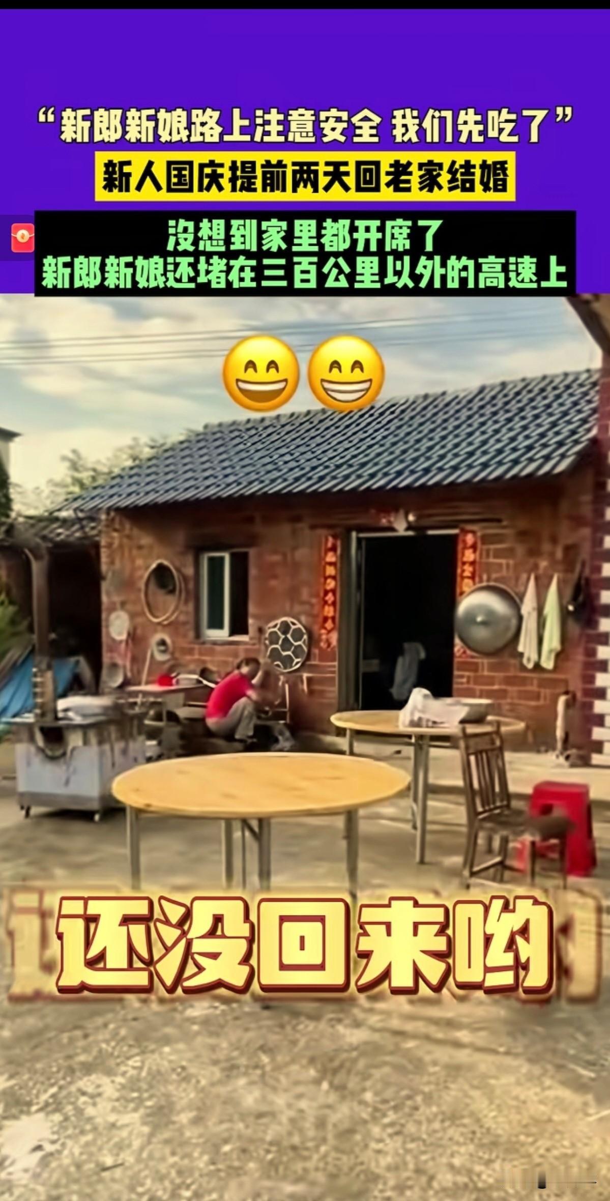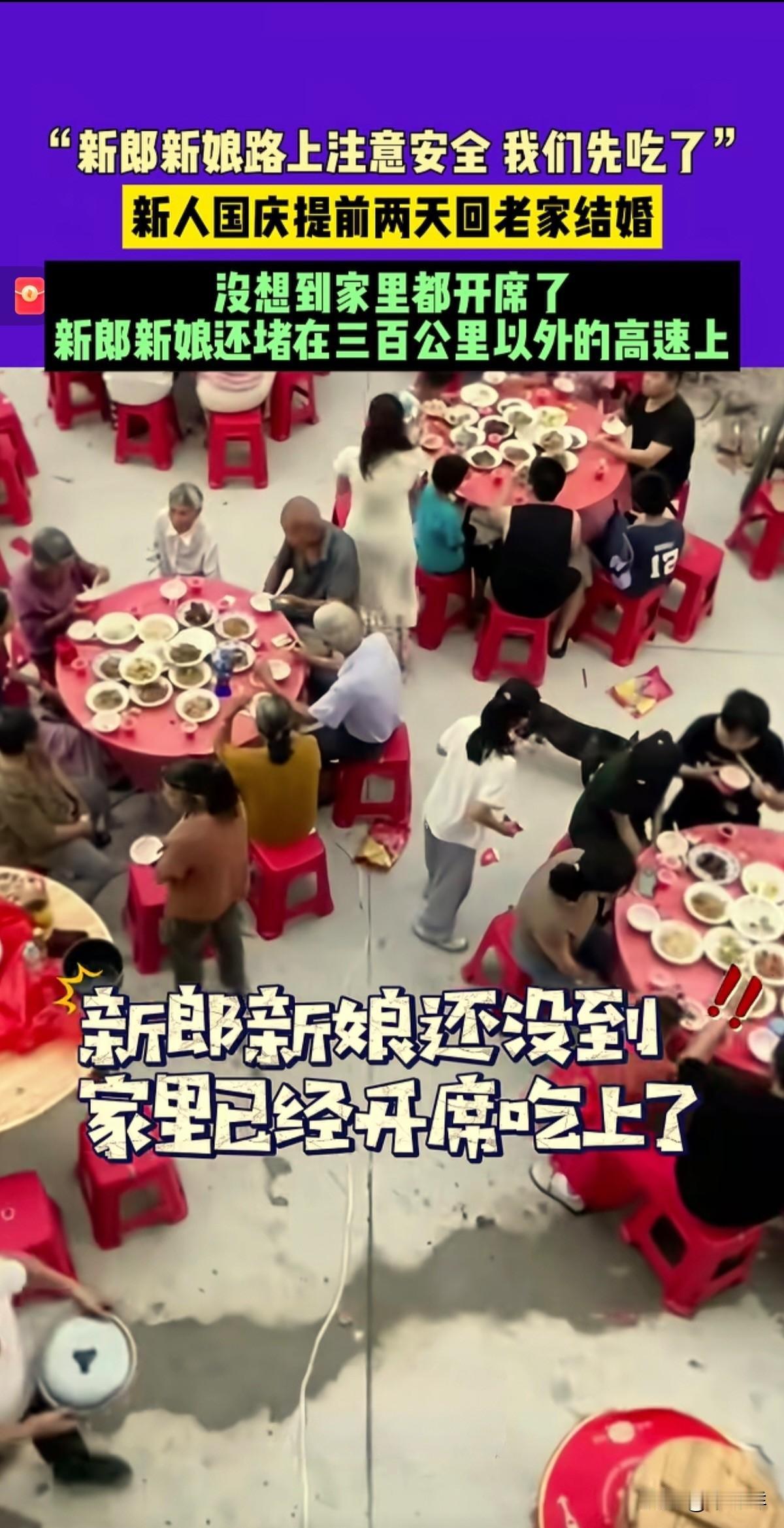 江西,一对新郎新娘订好10月3日在老家结婚办酒席,提前两天两人往家赶,没有人想到正席这天被堵在300公里的高速路上。 令人啼笑皆非的是,老家的亲戚朋友等不及了,老家的父母替他们把酒席开出来,大家吃的不亦乐乎! 邻居都开玩笑:“新郎新娘回来了没有?” 新郎父母:“还没回,堵在高速路上了!酒席正常吃!” 有网友说:“人家结婚是忙的吃不上席,他们只能在手机屏幕上看自己的席!” 小两口,真幸福,这个婚礼恐怕真的难以忘记!