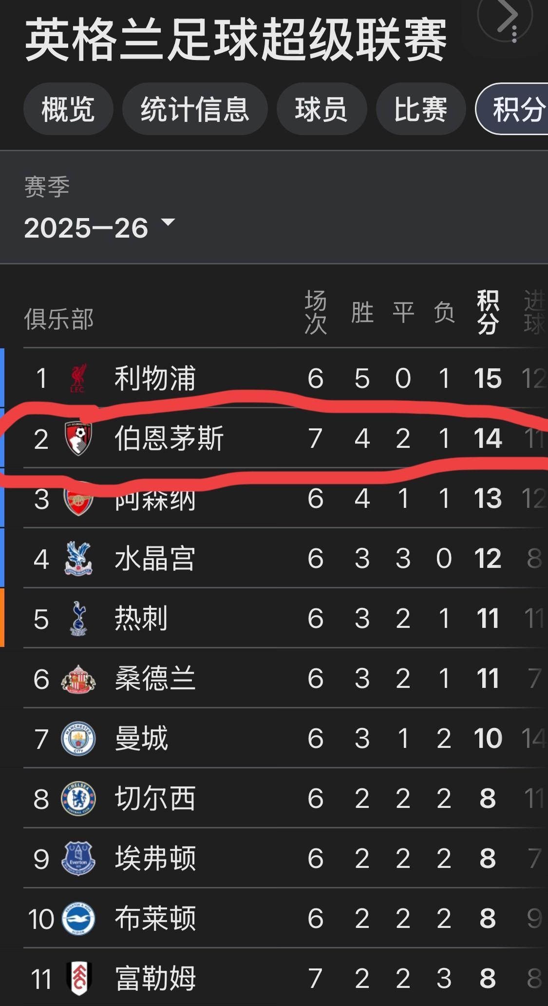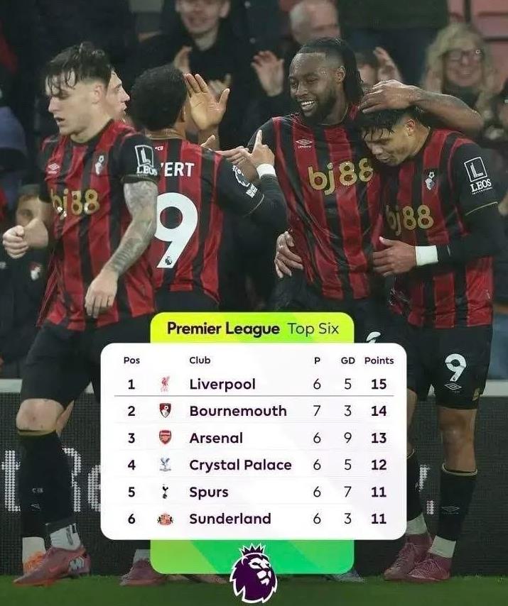 英超赛事; 第七轮第一场比赛,斯伯恩茅斯对阵富勒姆: 伯恩茅斯3比1击败富勒姆,自从揭幕战2比4败给利物浦后,伯恩茅斯豪取4胜2平的不败战绩,排名飙升至英超第二位! 不得不说,英超真的是无弱旅啊。 目前,排名前六的,只有三队是传统BIG 6,水晶宫已经连续18场不败,伯恩茅斯势头强劲,桑德兰的表现不像升班马。 英超真的是群雄并起。 伯恩茅斯的前锋塞门约已经贡献6球3助攻,只有哈兰德的数据比他更漂亮,而已。