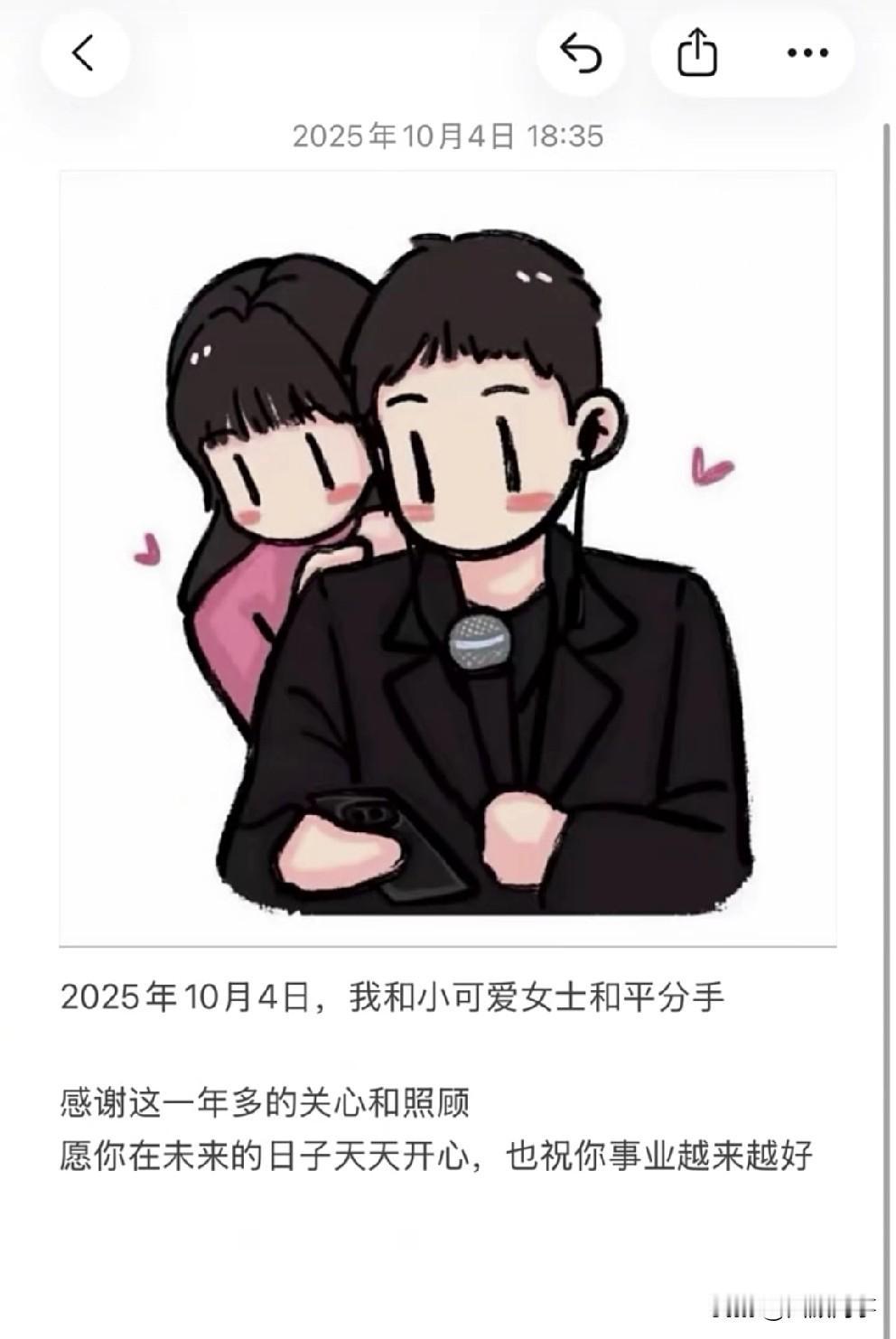 刘二狗发文,正式宣布与小可爱分手! 刘二狗发文称,2025年十月十四日,我与小可爱女士和平分手,感谢一年多的关心与照顾,愿你在未来的日子开心,也祝事业越来越好!