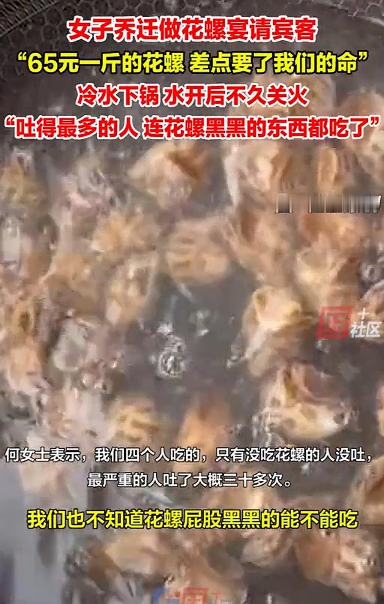 “心不是一般的大!”浙江绍兴,女子搬家请朋友吃饭,煮了一锅花螺,结果吃完几个人疯狂呕吐,最严重的一个人吐了三十多次。网友:“一看就是没煮熟!” 浙江绍兴一位女子搬新家请客,特意买了65元一斤的花螺招待朋友,诚意还是挺足的。 可奈何她这个厨艺实在不咋地,一开始她将花螺冷水下锅,但水开后不久就关火盛盘,压根就没想到花螺没煮熟。 她的朋友也是心大,都没意识到问题,直接就吃了起来,结果吃完饭没多久,四位客人中有三人出现呕吐症状。 而吃得最多的人最严重,他连花螺黑乎乎的内脏也吃了,结果吐了三十多次。 唯一没吐的是那位没吃花螺的客人,后来女子才知道,花螺尾部黑乎乎的地方不能吃,而且她烹饪时间可能不够,压根没把花螺煮熟! 这事传到网上,引起不少人讨论。有网友说,这么贵的海鲜差点成毒药。 也有人感慨:做饭光看价格不行,得会处理。 请客吃饭是好事,但食品安全不能大意。请客的人都想用好的食材招待朋友,但要是处理不当,反而会出问题。买贵的不如买对的,会做比舍得花钱更重要。 现在资讯发达,学东西方便,手机一搜就能找到各种食材的处理方法。所以请客前做点功课,既能展示手艺,又能保证安全。虽然可能不够熟练,但至少不会出大错。 朋友聚会重在情谊,不在排场。请客的人不必追求高档食材,家常菜也能吃出温暖。被请的人也不会计较吃喝,大家在一起聊天开心最重要。 就像老同学聚会,一碗面条也能吃出当年情谊,你说呢?
