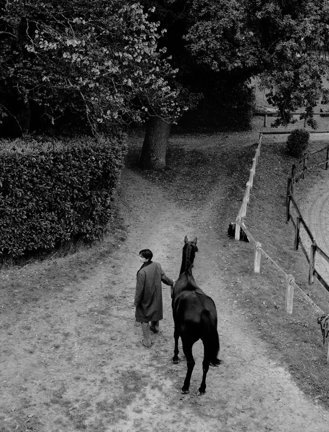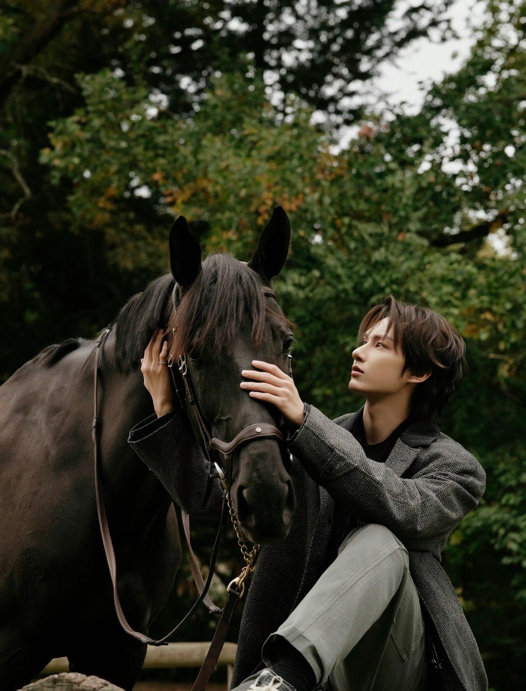 灰色长款大衣配枫树很有腔调了