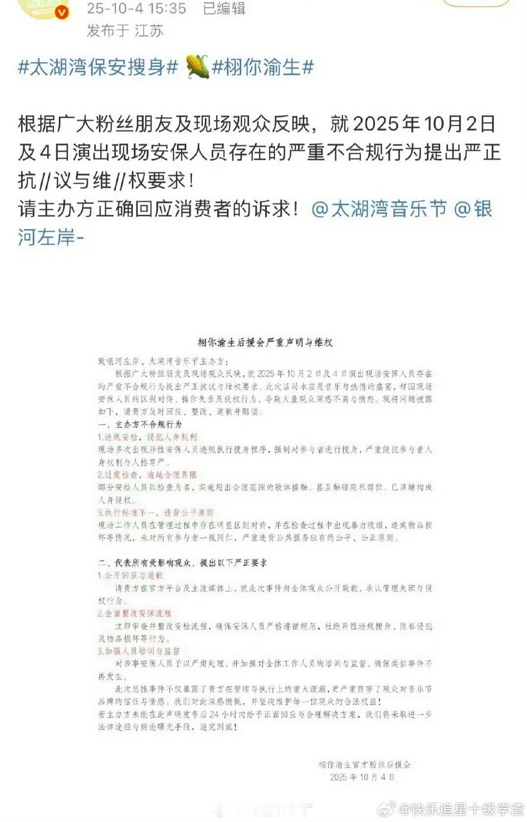 有粉丝向太湖湾音乐节维权说安保对粉丝进行了搜身