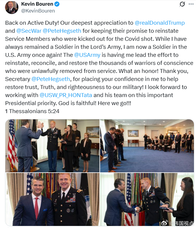 我向特朗普总统和战争部长海格塞斯致以最深切的感谢,感谢他们兑现了承诺——让那些因拒打新观疫喵而被开除的服役人员重返部队。