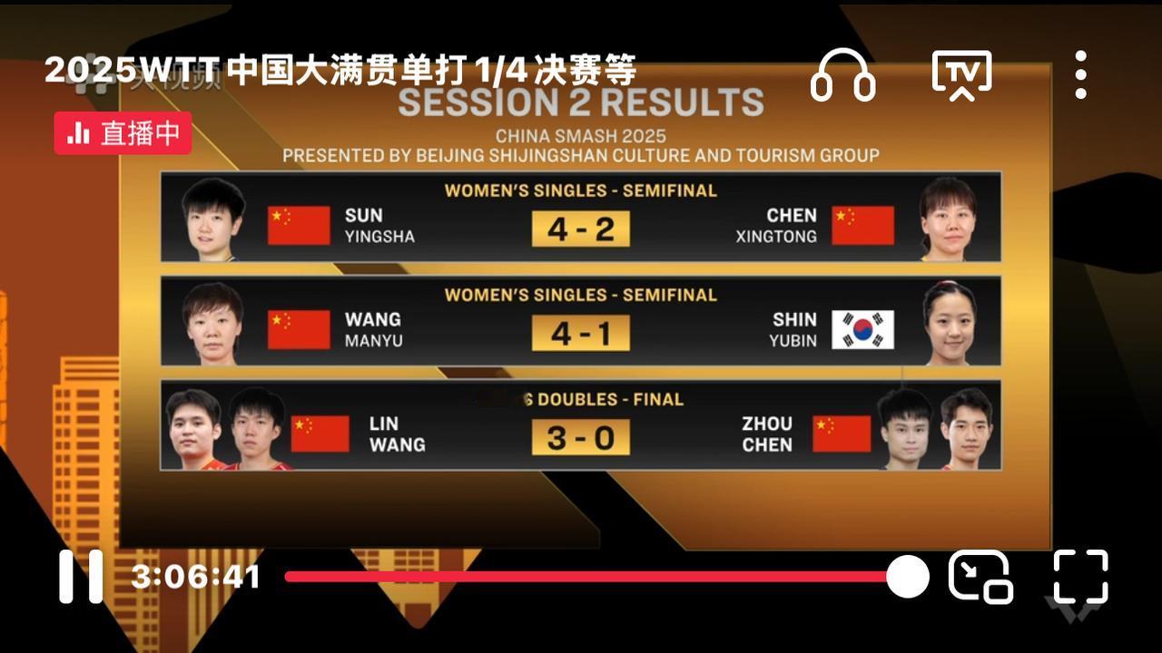 [烟花]恭喜孙颖莎和王曼昱晋级决赛,她们将在明晚最后一场2025 WTT中国大满贯对弈中争夺女单冠军![烟花] [烟花]恭喜王楚钦/林诗栋获得男双冠军,陈俊菘/周启豪获得男双亚军[烟花] 今晚看完女单半决赛孙颖莎🆚陈幸同、男双决赛王楚钦/林诗栋🆚陈俊菘/周启豪的较量,我心里满是感动。他们不仅展现了赛场上的拼劲,更藏着队友间动人的默契与温情——这两场球既足够精彩绝伦,又不时让人会心一笑。 尤其难忘孙颖莎与陈幸同的对决。第六局孙颖莎10-7率先拿到赛点,陈幸同却连打两个相同线路的擦边球,将比分追至9-10。这剑拔弩张的时刻,球桌两端的反应却格外暖心:陈幸同笑着举手致歉,另一边的孙颖莎也忍不住弯了嘴角,全场观众的笑声也跟着响起来。即便最后孙颖莎拿下这一局,握手时两人依旧笑得灿烂——这样的氛围,实在让人动容。 男双赛场同样温暖,王楚钦/林诗栋成功夺冠后,与陈俊菘/周启豪的互动依旧轻松融洽,没有胜负带来的疏离感。 感谢现役! (视频截图)