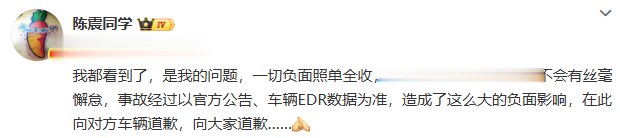 “我都看到了,是我的问题,一切负面照单全收,全力配合解决问题中,不会有丝毫懈怠,事故经过以官方公告、车辆EDR数据为准,造成了这么大的负面影响,在此向对方车辆道歉,向大家道歉。”