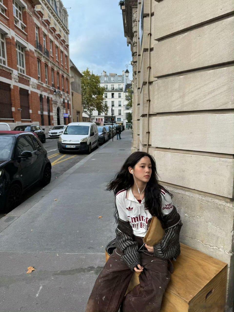 欧阳娜娜耳机到底在听什么巴黎街头随拍美到犯规!白T配深棕裤清爽又大气,微卷长发