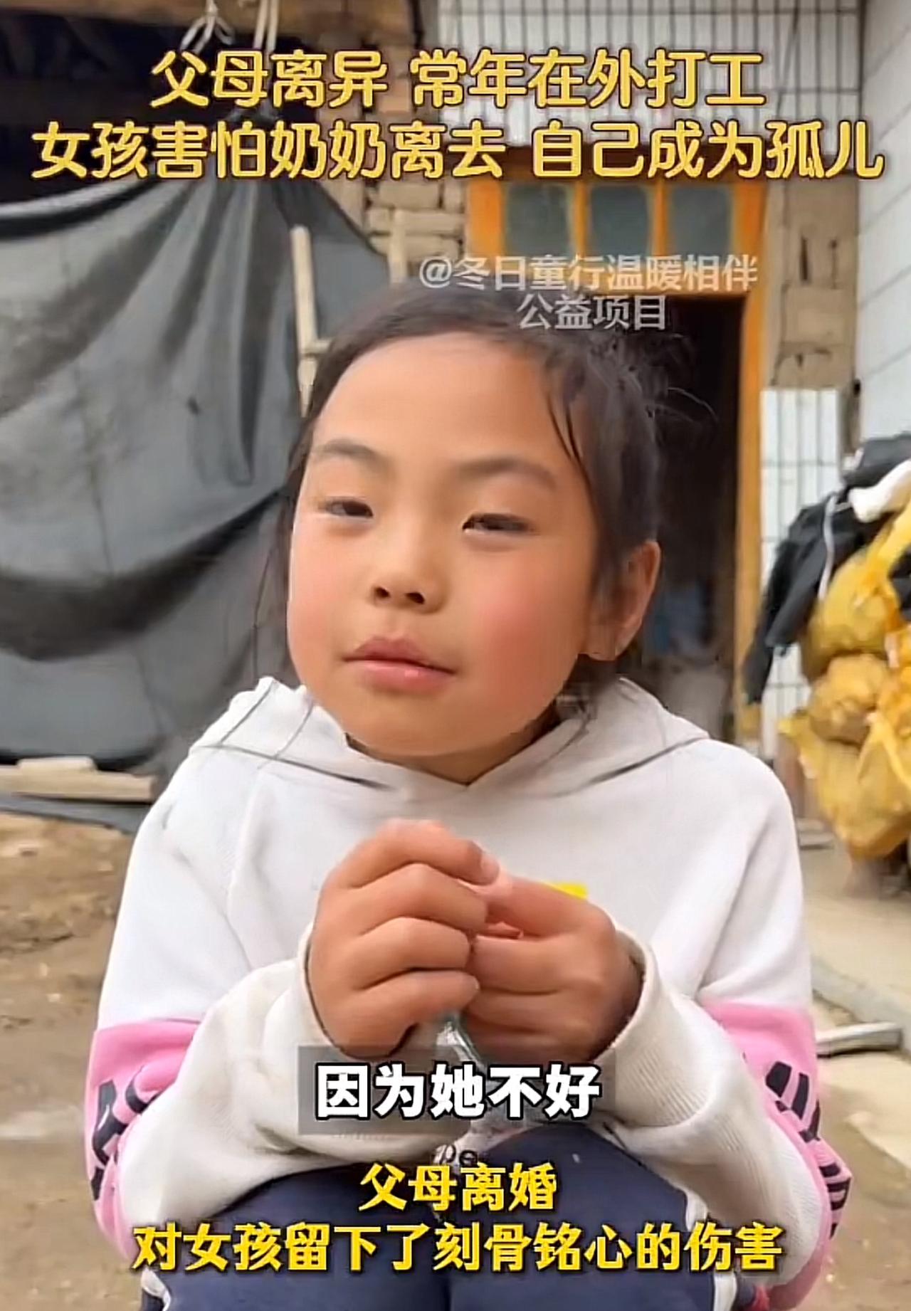 “当你们要离婚,决定前请多想想孩子”,父母离婚影响最大的就是孩子,图片中这位女孩在父母离婚后父亲在外打工,孩子由奶奶抚养,她的母亲因为和其他男人组成新的家庭抛弃了她和她的哥哥,镜头面前她表露害怕奶奶去世,希望妈妈被抓起来坐牢,因为她的妈妈导致她和她哥哥的家庭散了。懂事又令人心疼,眼神中散发出的是渴望关爱的目光。随着社会经济的发展,许多已婚的夫妻面对社会有许多形形色色的诱惑,有一部分选择了拥抱欲望,哪怕放弃孩子也在所不辞。这样的风气导致社会上孤儿,单亲爸爸,单亲妈妈的孩子越来越多,也间影响了孩子的价值观。面对这种危机,全社会应该要凝聚共识,一个家庭是不易的,生了孩子就要负责到底,哪怕不爱了,只要日子过得下去也请不要轻易离婚,因为难保下一个会比原来的更好!离婚以后的感悟 不能离婚的情形