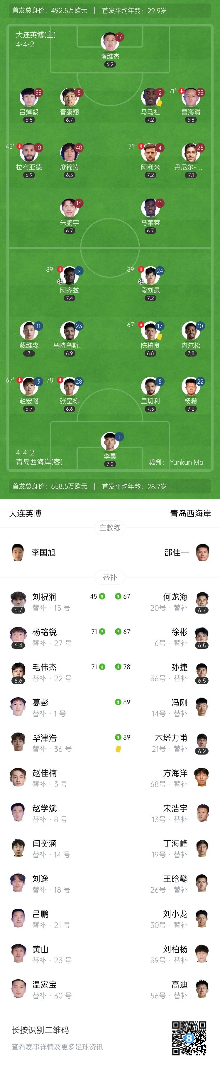 直播吧10月4日讯北京时间10月4日晚上19:35,中超第23轮,大连英博坐镇中升梭鱼湾球场迎战青岛西海岸。上半场,阿齐兹扫射破门。下半场,段刘愚锁定胜局。全场结束,大连英博0-2青岛西海岸。